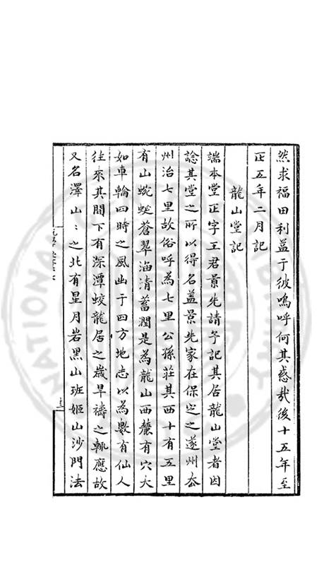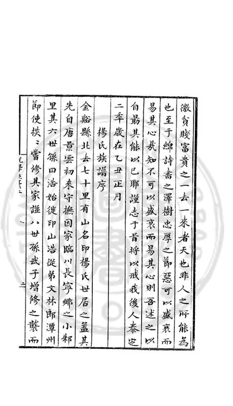 金谿縣北去七十里有山名印楊氏世居之盖其先自唐景雲初來守撫因家臨川長寧鄉之小邾里其六世孫曰浩婀徙印山浩従弟文林郎潭州莭使掞掞當修其家諩八世孫武子增修之襲而