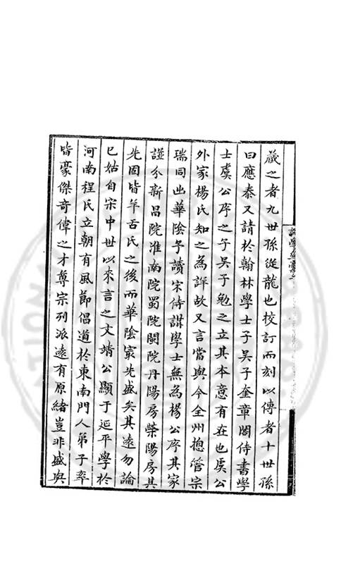 藏之者九世孫従龍也校訂而刻以傳者十世孫曰應泰又請於翰林學士子吴子奎章閣侍書學士虞公序之子吴子勉之立其本意有在也虞公外家楊氏知之為詳故又言當與今全州摠管宗瑞同出華隂予讀宋時講學士無為楊公序其家諩兮新昌院淮南院蜀院閩院丹陽房榮陽房其先固皆羊舌氏之後而華隂家先盛矣其遠勿論已姑自宋中世以來言之丈靖公顯于廷平學於河南程氏立朝有風莭倡道於東南門人弟子率皆豪傑竒偉之才尊宗列派遠有原緒豈非盛與