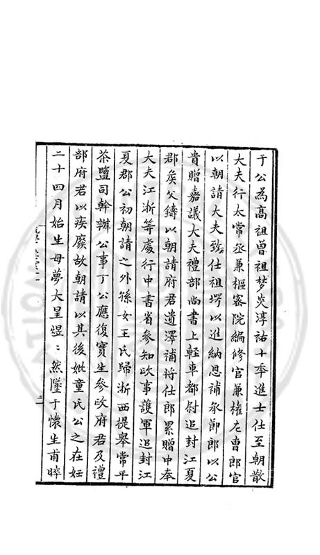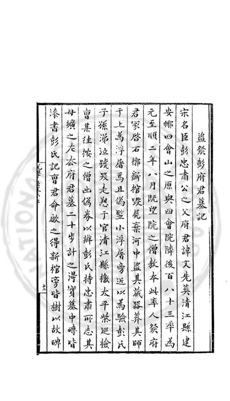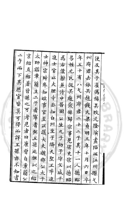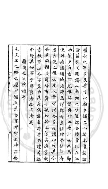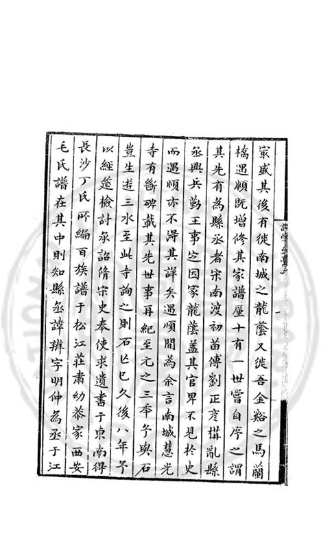 最盛其後有徙南城之龍蔭又徙吾金谿之馬蘭橋遇順既增修其家譜厘十有一世嘗自序之謂其先有為縣丞者宋南渡初苗傳劉正彥構亂縣丞興兵勤王事㝎因家龍蔭盖其官卑不見於史而遇順亦不淂其詳矣遇順間為余言南城慧光寺有斷碑載其先世事再紀至元之三秊予與石豈生遊三水至此寺詢之則石亾已久後八年予以経筵檢討承詔脩宋史奉使求遺書于東南得長沙丁氏所編百族譜于松江莊肅幼恭家西安毛氏譜在其中則知縣丞諱辨字明仲為丞于江