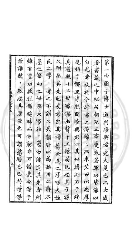 第一由國子博士通判隆興者堯夫是也而大成著書藏之中祕昌朝死王事慶來著軍功皆能以自見者故於今詩書之傳綿綿而未艾世以忠厚見稱于鄊里淳熈間隆興君以其世譜刻石于修真道觀十三世孫傑出贅于五港荀氏恐其子孫久則𦯌其先也爰考㝎其譜屬余為之序嗟夫姓氏之學學者之不講久矣類皆以為無用之辨不急之察向之世族大家徃徃漫勿能道其先者則雖有豐功盛烈猶晦昧而勿彰非可惜哉今傑于茲譜兢克然恐其湮沒也可謂慈孫也已於讀傑