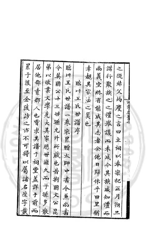 臨川王氏世譜一卷宋累贈太師中書令兼尚書令英國公十三世孫乆升所藏也昔荊國文公昆弟以政業文學克大其家歷世滋久而子孫多散居他郡素郡人也嘗求其譜于祠堂盖詳于前而累于後至金陵訪之亦不可得以屬諸名垕字載