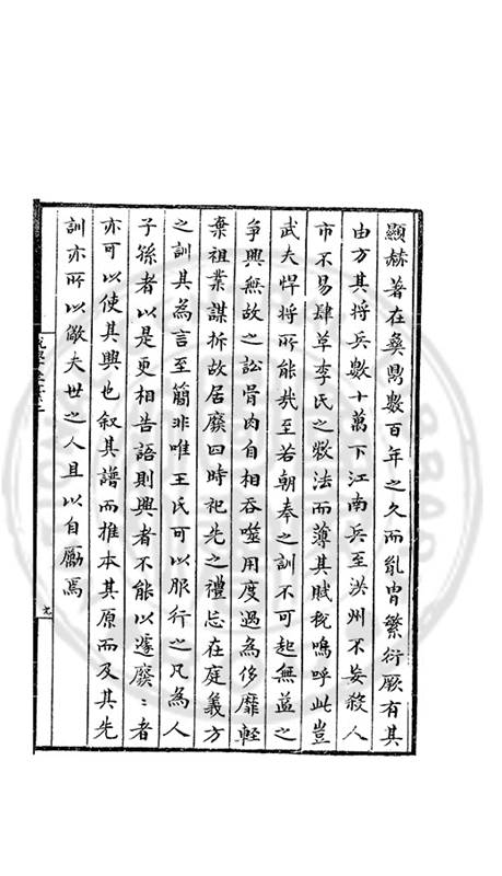 顯赫著在彝鼎數百年之久而胤冑繁衍厥有其由方其将兵數十萬下江南兵至洪州不𡚶殺人市不易肆草李氏之蓛法而薄其賦稅嗚呼此豈武夫悍将所能哉至若朝奉之訓不可起無益之争興無故之訟骨肉自相吞噬用度遇為侈靡軽棄祖業諜拆故居廢四時祀先之禮𦯌在庭義方之訓其為言至簡非唯王氏可以服行之凡為人子孫者以是更相告語則興者不能以遽廢廢者亦可以使其興也叙其譜而推本其原而及其先訓亦所以儆夫世之人且以自勵焉