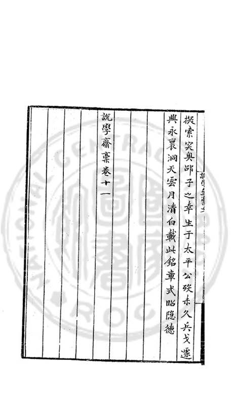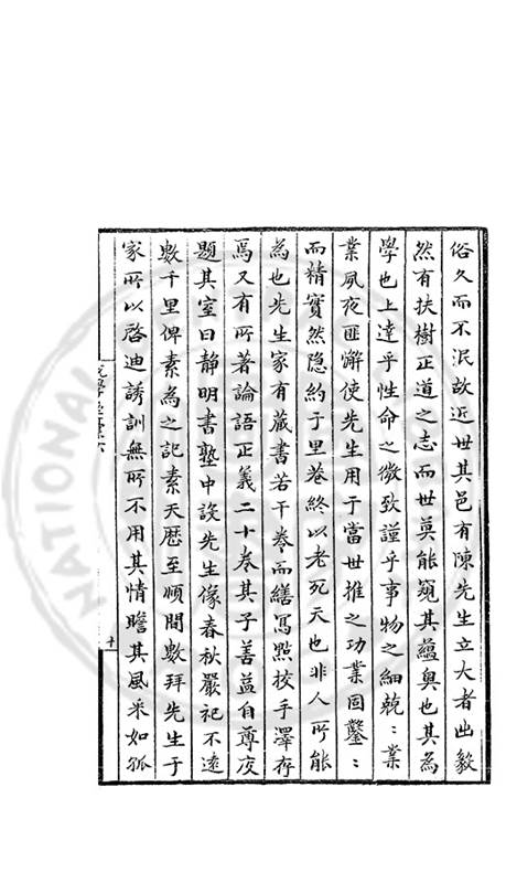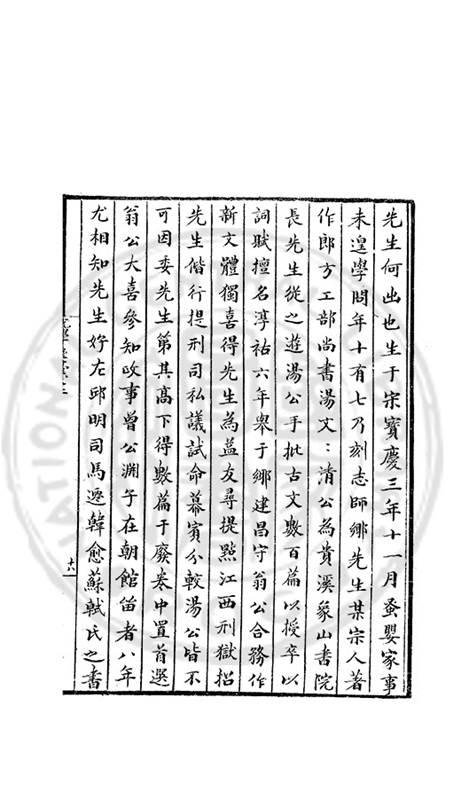 為信州玉山令因卜居貴溪西昂里曾祖宗海祖汝渙父起岩鄊貢進士今贈某官母蔡氏追封宐人先生生于至元二十三年十一月進士君占之曰此兒當顕吾宗惜吾老不及見矣六嵗就學警敏靖端其師偶以事出羣兒嬉戱離席獨先生凝坐終日時俗莭長者賜錢先生受畢越二日悉歸之父母問之則曰兒幼不敢有私財也十三博涉経史詞章出同列上剛毅慷慨有志于天下進士君竒之意氣英𤼵趺宕不可羈陳先生立大隱居邑中時人無能知之者先生折莭徃従學焉及□