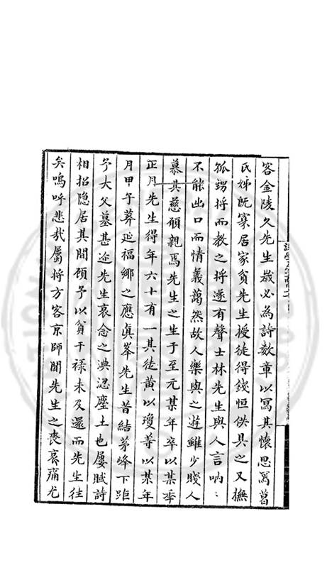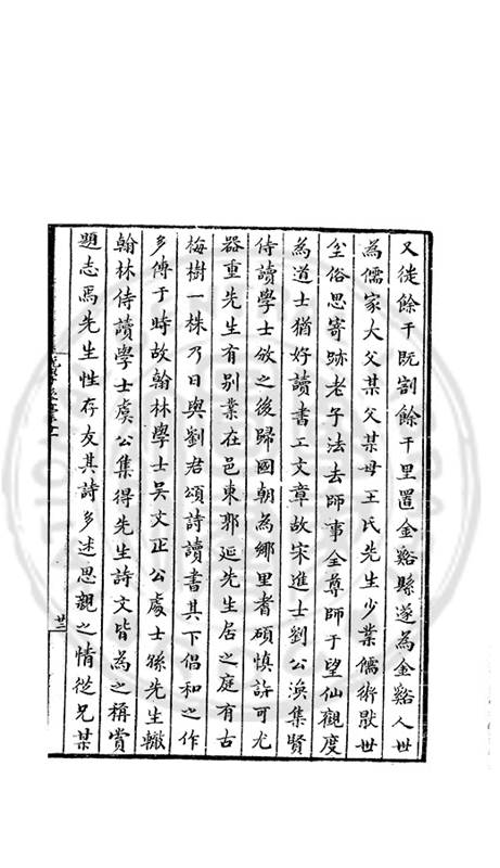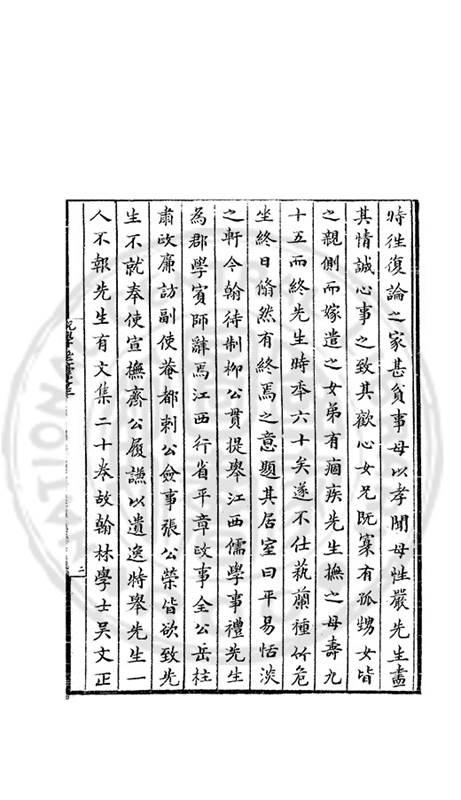 時徃復論之家甚貧事母以孝聞母性嚴先生盡其情誠心事之致其歡心女兄既寡有孤甥女皆之親側而嫁遣之女弟有痼疾先生撫之母壽九十五而終先生時秊六十矣遂不仕蓻蘭種竹危坐終日翛然有終焉之意題其居室曰平易恬淡之軒今翰待制柳公貫提舉江西儒學事禮先生為郡學賓師辭焉江西行省平章政事全公岳柱肅政廉訪副使菴都剌公僉事張公榮皆欲致先生不就奉使宣撫齊公履謙以遺逸特舉先生一人不報先生有文集二十卷故翰林學士吴文正