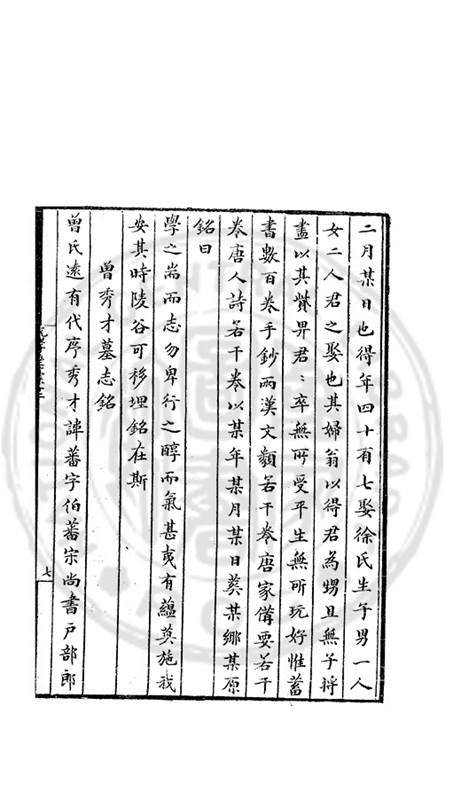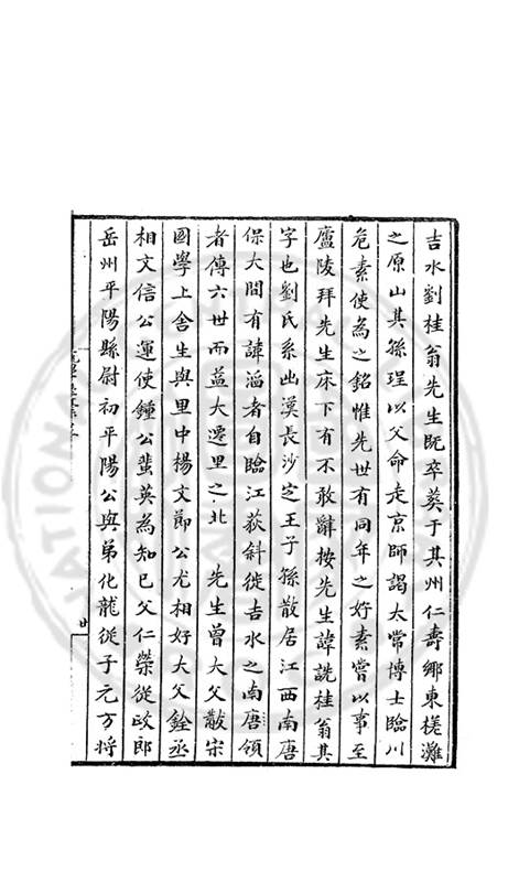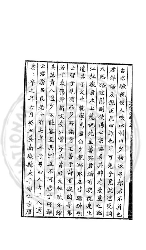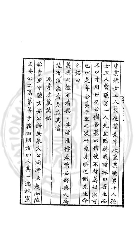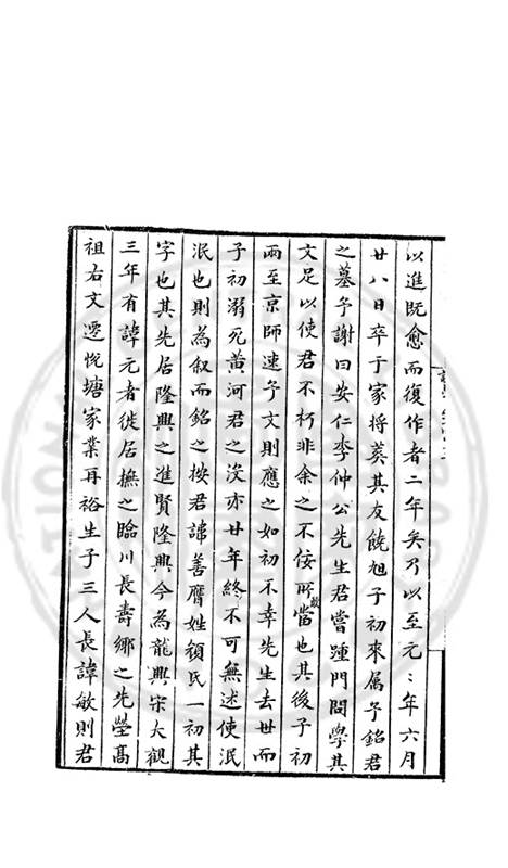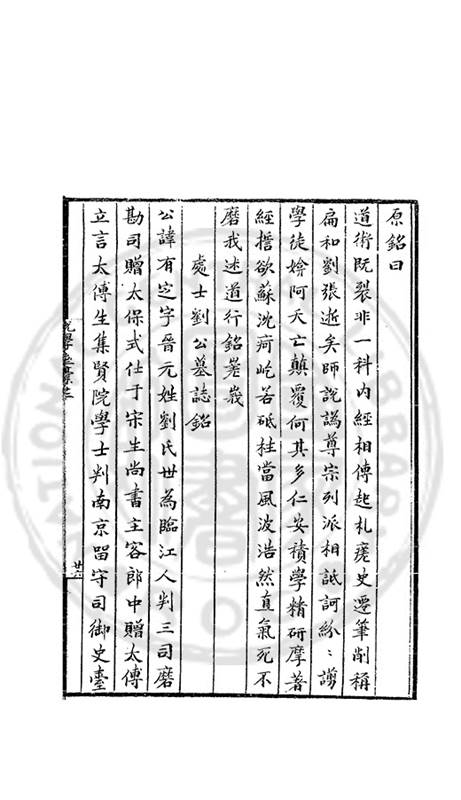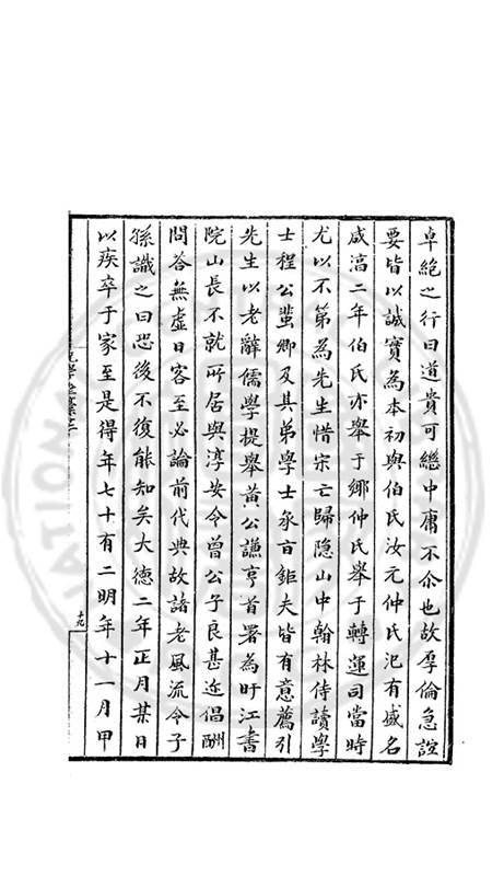 酉疾病起居如常時潯州推官曾君煜來問疾猶告之以善客退日已哺其子文中進藥卻不飲先生曰吾不可起矣文中亟扶抱已收足而逝貧不能行禮明年八月文中始克扶□北歸十月壬申至豫章文中亦以疾卒于舟中先生娶徐氏先一年卒追封宐人子男三人文中申同文剛申同先卒孫男二人女一人以沒之又明年某月某甲子葬于某鄊某原其門人某等以書抵京師属素述其始終請銘當世之君子昔者朱文公陸文安公同時並起以明道樹教為已事辨論異同朋友之