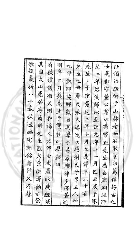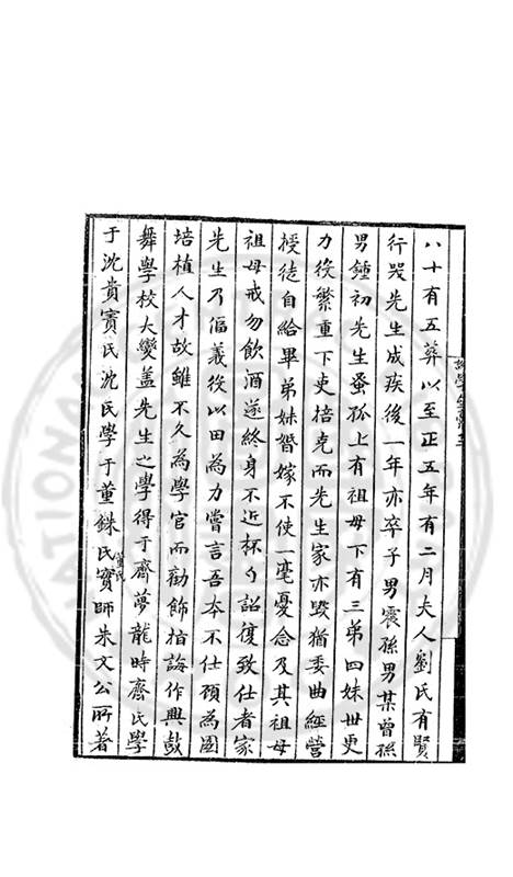 八十有五葬以至正五年有二月夫人劉氏有賢行哭先生成疾後一年亦卒子男震孫男某曾孫男鍾初先生蚤孤上有祖母下有三弟四妹世更力役繁重下吏掊堯而先生家亦毀猶委由経營授徒自給畢弟妹婚嫁不使一毫憂念及其祖母祖母戒勿飲酒遂終身不近杯勺詔復致仕者家先生乃偪義役以田為力嘗言吾夲不仕頋為國培植人才故雖不久為學古而勸飾指誨作興鼓舞學校大變盖先生之學得于齊夢龍時齊氏學于沈貴寶氏沈氏學于董銖氏董氏實師朱文公所著