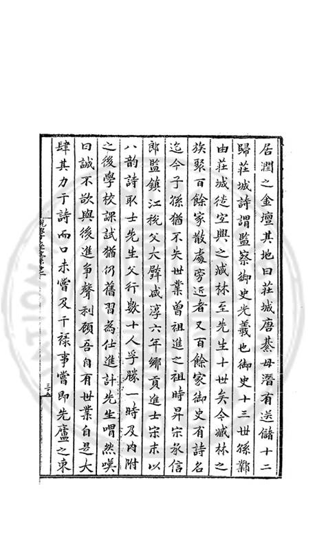 居潤之金壇其地曰荘城唐綦母潛有送儲十二歸荘城詩謂監察御史光義也御史十三世孫鄴由荘城徙宐興之臧林至先生十世矣今臧林之族聚百餘家散䖏旁近者又百餘家御史有詩名迄今子孫猶不失世業曾祖進之祖詩昇宋承信郎監鎮江稅父大□咸淳六年鄊貢進士宋未以八韵詩取士先生父行數十人孚勝一時及內附之後學校課試猶仍舊習為仕進計先生喟然嘆曰誠不欲與後進争聲利頋吾自有世業自是大肆其力于詩而口未嘗及干祿事嘗即先廬之東
