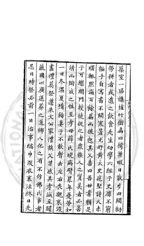 嗚呼王澤既竭樸散淳漓嗟若先生惟古是師脄綜百家浩浩其博潜心聖経爰得真樂智圎行方外和內剛動静居䖏率履其常敬養慈親閭黨稱孝錫顏之仁推以施教蕭蕭竹林有書有琹清風