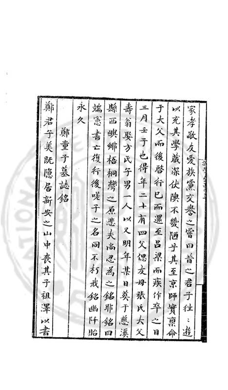 家孝敬友愛族黨交譽之嘗曰昔之君子徃徃遊以充其學蔵深伏隩不幾陋乎其至京師實稟命于大父而後啓行已而遠至呂梁而疾作卒之日三月壬子也得年二十有四父偲友母張氏大父壽翁娶方氏子男一人以又明年某日葬于慈溪縣西嶼鄊梧桐灣之原悲夫尚忍為之銘耶銘曰端憲書亡復行後嗟子之名同不朽我銘幽阡貽永久