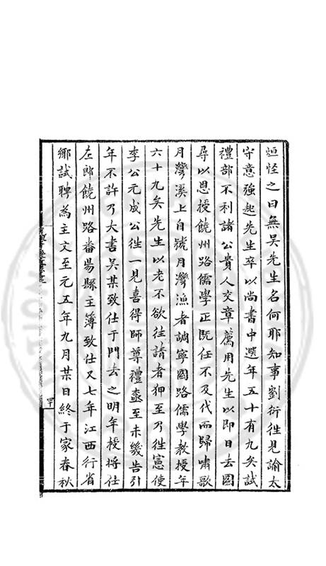 烜怪之曰無吴先生名何耶知事劉衍徃見諭太守意強起先生卒以尚書中選年五十有九矣試禮部不利諸公貴人交章薦用先生以即日去國尋以恩授饒州路儒學正既任不及代而歸嘯歌月灣溪上自號月灣漁者調寜國路儒學教授年六十九矣先生以老不欲徃請者狎至乃徃憲使李公元成公徃一見喜得師尊禮極至未姆告引年不許乃大書吴某致仕于門去之明年授将仕左郎饒州路畨易縣主簿致仕又七年江西行省鄊試聘為主文至元五年九月某日終于家春秋