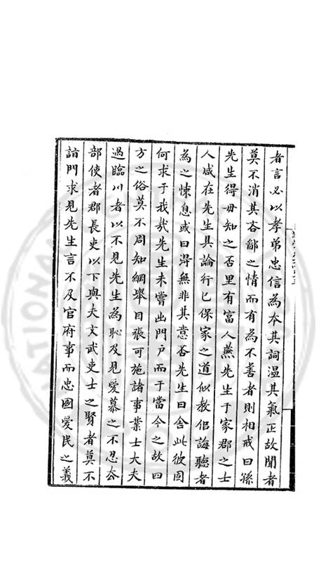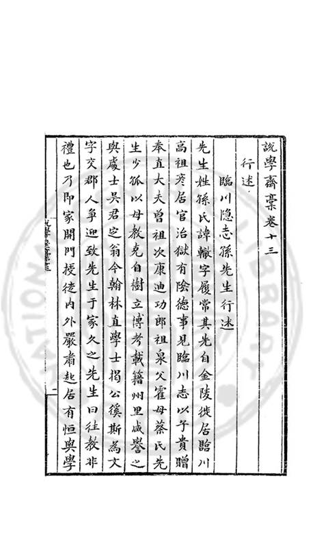 者言必以孝弟忠信為夲其詞溫其氣正故聞者莫不消其吝鄙之情而有為不善者則相戒曰孫先生得毋信之否里有富人燕先生于家郡之士人咸在先生具論行己保家之道似教侶誨聴者為之悚息或曰淂無非其意否先生曰舍此彼固何求于我哉先生未嘗出門户而于當今之故四方之俗莫不周知綱舉目張可施諸事業士大夫過臨川者以不見先生為恥及見愛慕之不忍厺部使者郡長吏以下與夫文武吏士之賢者莫不詣門求見先生言不及官府事而忠國愛民之義