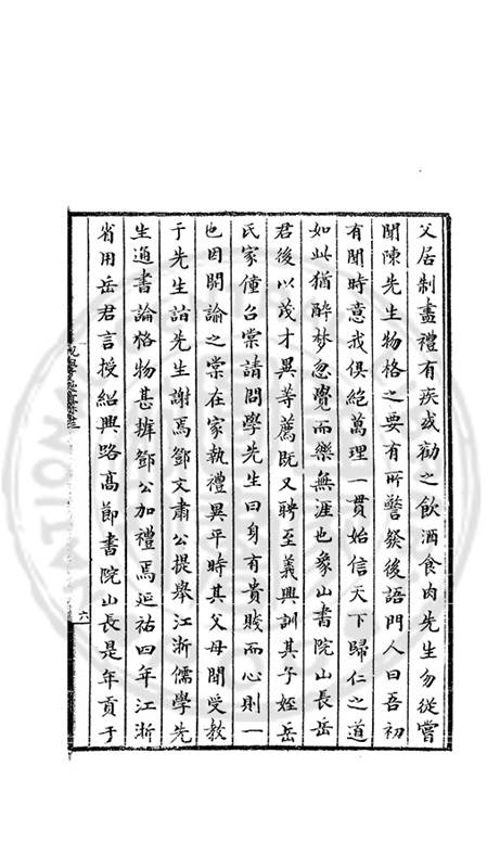 父居制盡禮有疾或勸之飲酒食肉先生勿従嘗聞陳先生物格之要有所警𤼵後語門人曰吾初有聞時意我俱絕萬理一貫始信天下歸仁之道如此猶酔梦忽覺而樂無涯也象山書院山長岳君後以茂才異等薦既又聘至義興訓其子姪岳氏家僮召棠請問學先生曰身有貴賤而心則一也因開諭之棠在家執禮異平時其父母聞受教于先生詣先生謝焉鄧文肅公提舉江浙儒學先生通書論格物甚辨鄧公加禮焉延祐四年江浙省用岳君言授紹興路高莭書院山長是年貢于