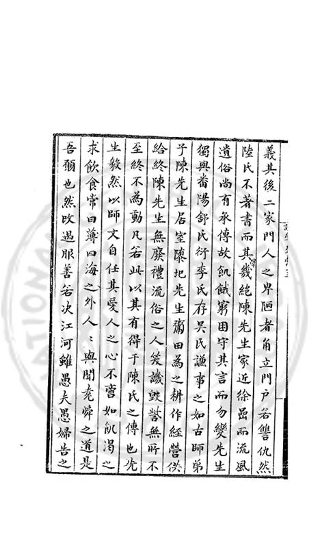 義其後二定門人之卑陋者角立門户若讐仇然陸氏不著書而其淳幾絕陳先生家近徐喦而流風遺俗尚有承傳故飢餓窮困守其言而勿變先生獨與畨陽舒氏衍李氏存吴氏謙事之如古師弟子陳先生居室隳圯先生鬻田為之耕作経營供給終陳先生無廢禮流俗之人笈譏毀訾無所不至終不為動凡若此以其有得于陳氏之傳也先生毅然以師文自任其愛人之心不啻如飢渴之求飲食常曰薄四海之外人人與聞堯舜之道是吾願恢然改過服善若决江河雖愚夫愚婦告之