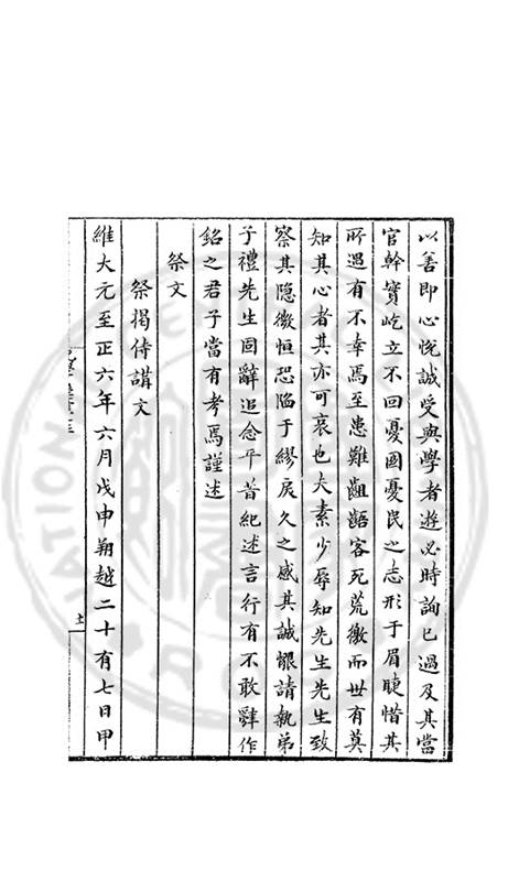 明月講說古今治道民瘼靡不精究浮雲富貴於我何有元老大臣奨拔幽潜執持銓衡而使滯淹小子弱冠執贄林下頋茲魯鈍實藉陶冶自時厥後嵗一再逢情逾款密詠歌従容昔将遠遊書來戒止遺翰盈箱文辭婉委勿量蕪陋亦偕有言訑訑所距乃尒欣然最後今年家罹訟事旅寓在鄰無日不至春分祭已頋枉招呼舉尊相属訓練勤劬別甫逾時凶聞忽達老成云亾佇立悲怛自昔逹人視死如稍鄊無楷蓻來者疇依晦跡門里流光朝野高丟凜然百世之下旨酒潔清恭奠于庭