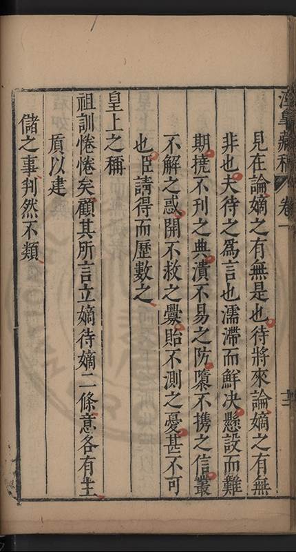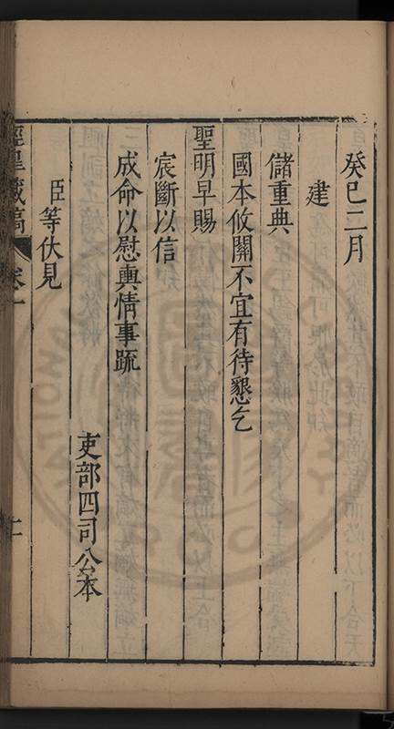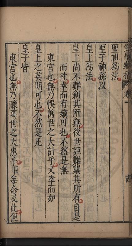 萬年無疆之業近而四海臣民之注望遠而九夷八蠻之觀聽君子小人之所顧盼而咨嗟宮闈近習之所望風而承㫖 社稷安危在此一舉 皇上奈何易視之而閣臣奈何𡮢試之臣且不敢危言以激 皇上兼忤閣臣調停之意亦不敢漫述漢宋故典及 祖宗朝遠事以滋煩凟敬體 皇上法祖一念直㨿 世宗肅皇帝 穆宗莊皇帝近事請 皇上法之 世宗肅皇帝於嘉靖十八年册立 東宮該禮臣具題故