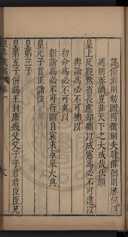 事臣等始遂不能無疑及聞人言嘖嘖 封王之諭乃錫爵以寸晷立就即次輔趙志臯張位竝不得與聞而禮臣羅萬化科臣張貞觀部臣于孔兼等俱至錫爵私寓乃不得其一面始知今日之詔皇上以一人議之臣等不至病狂䘮心寧敢無言以負 皇上昔人有言天下事非一家私事蓋言公也况以 宗廟社稷之計而可付之一人之手乎 皇上試清心而籌今日 册立一事其關係何如前而 祖宗九廟之靈後而子孫億