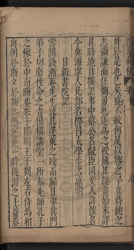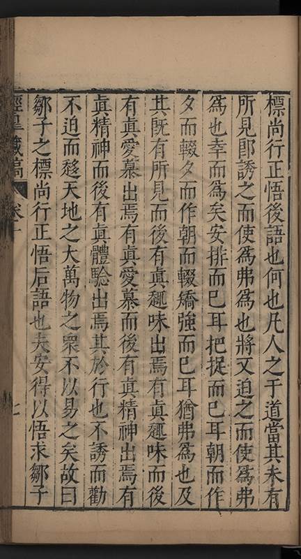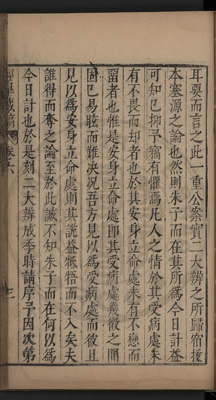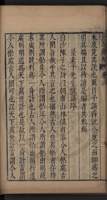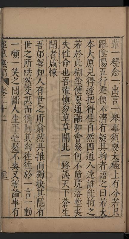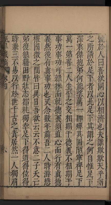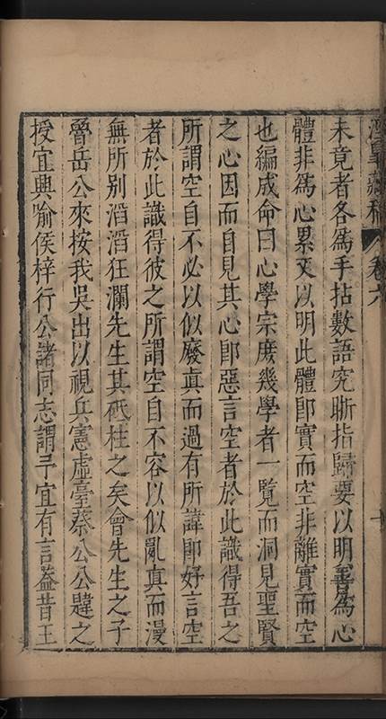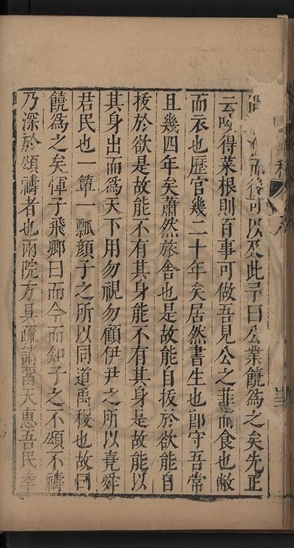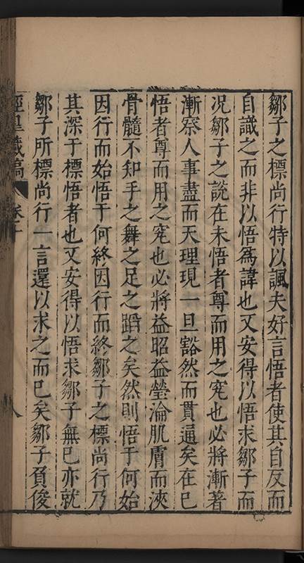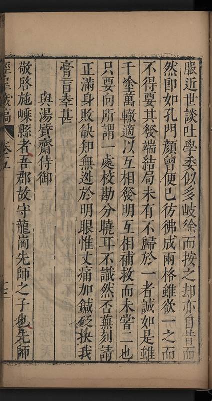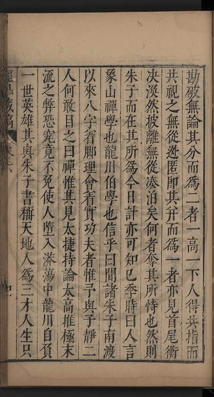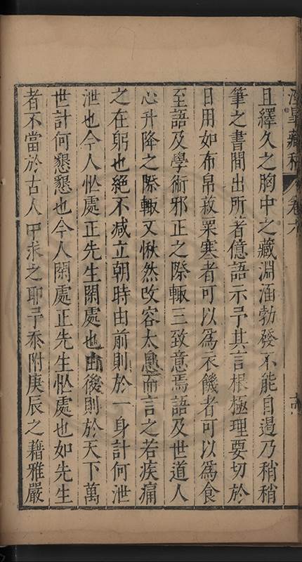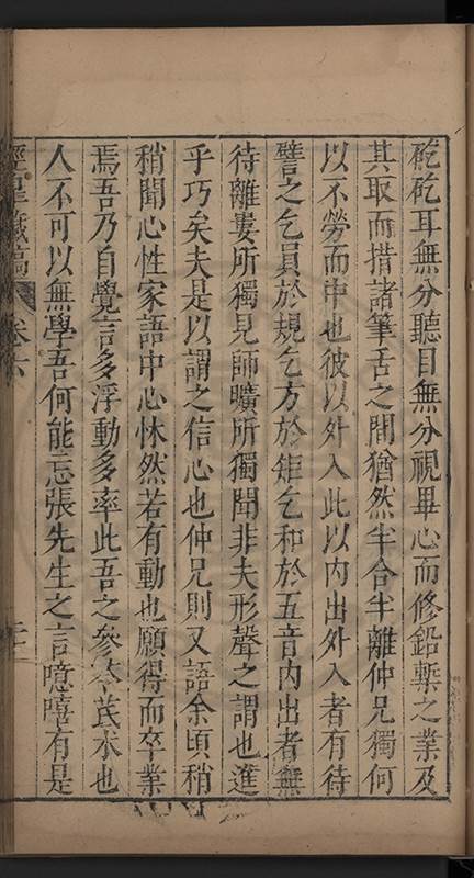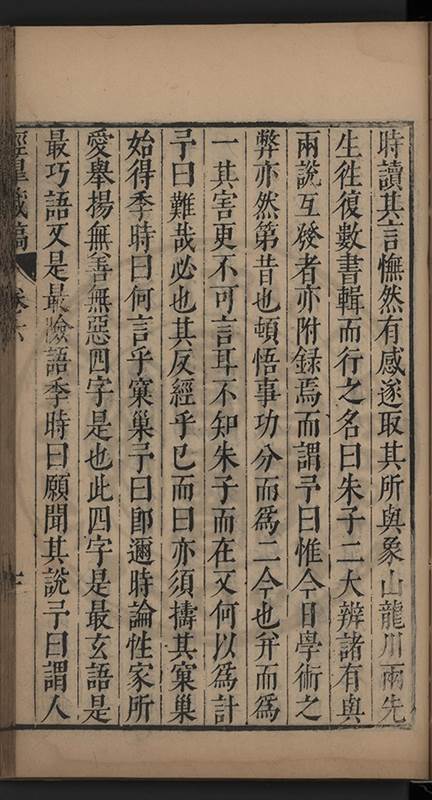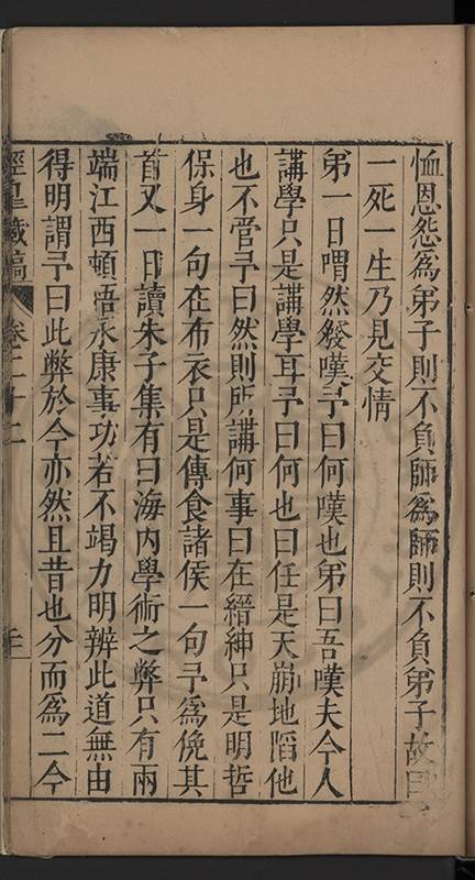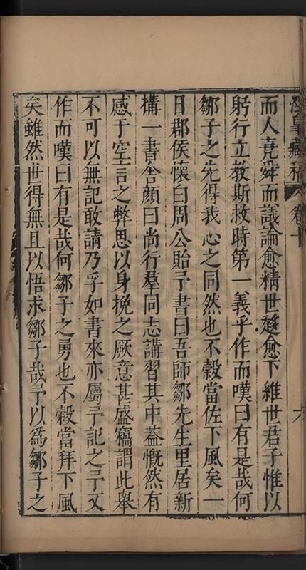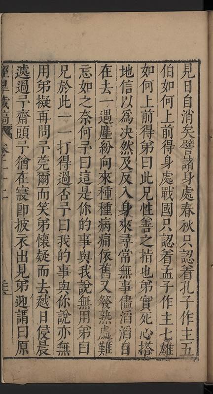 弟一日喟然發嘆予曰何嘆也弟曰吾嘆夫今人講學只是講學耳予曰何也曰任是天崩地䧟他也不管予曰然則所講何事曰在縉紳只是明哲保身一句在布衣只是傳食諸侯一句予爲俛其首又一日讀朱子集有曰海内學術之弊只有兩端江西頓悟永康事功若不竭力明辨此道無由得明謂予曰此弊於今亦然且昔也分而爲二今