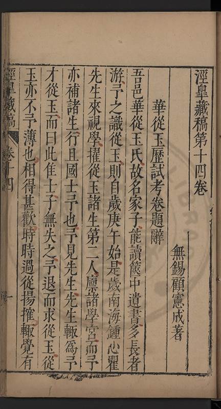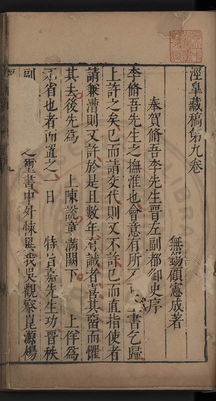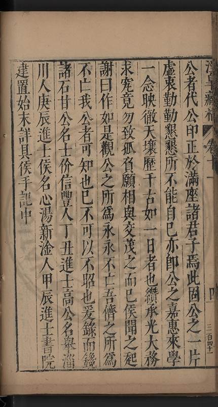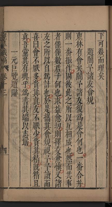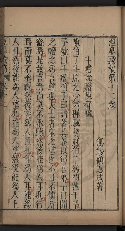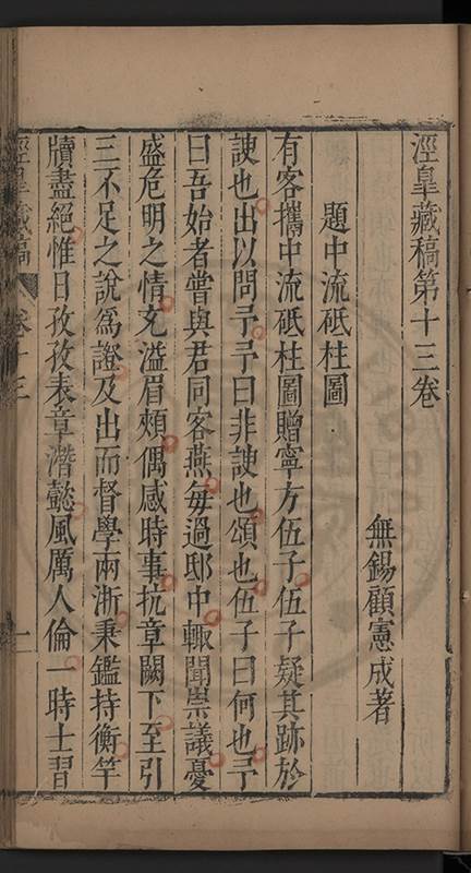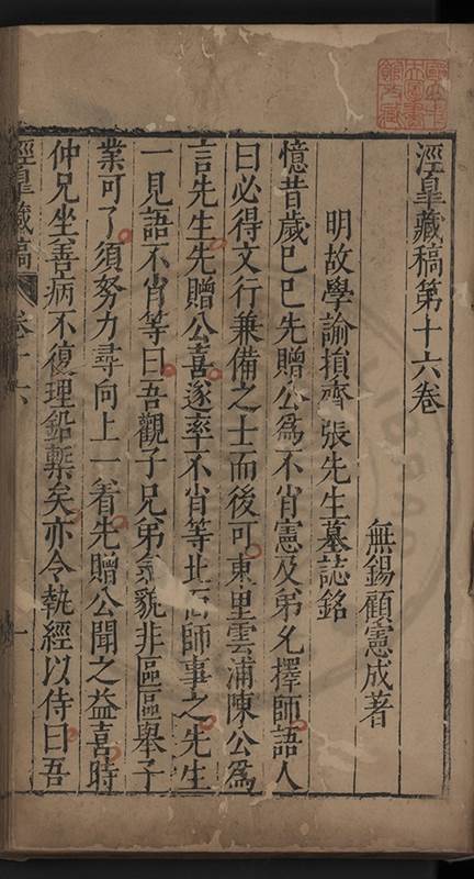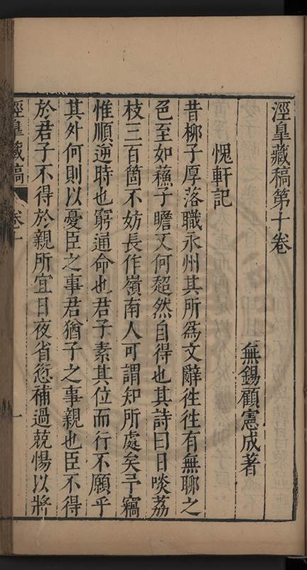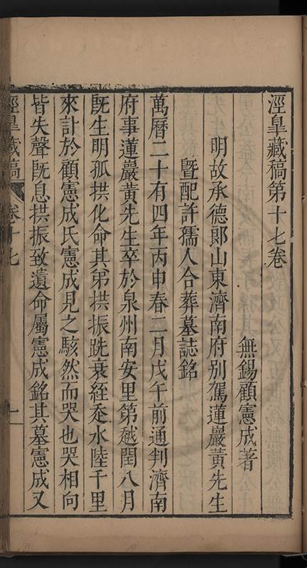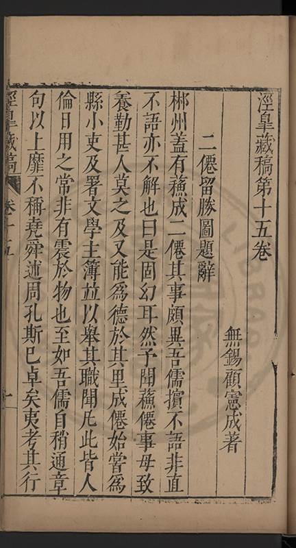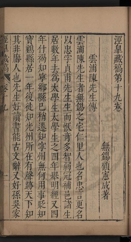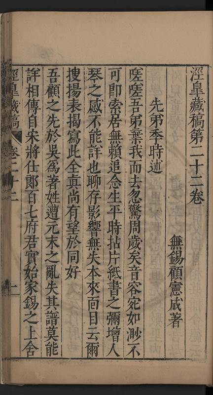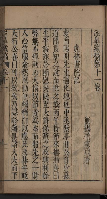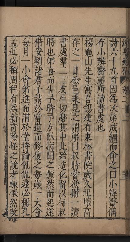 楊龜山先生寓吾錫建有東林書院歲久圯壞高存之一日檢邑乗見之謂弟曰叔時𡮢欲搆一讀書處羣二三友生切磨其中此殆造化留以待叔時也弟喜而告予時予方臥病聞之蹶然而起遂偕安劉諸君子請於當道而修復之每歲一大會毎月一小會弟進而講於堂持論侃侃遠必稱孔孟近必稱周程有爲新竒險怪之説者輙愀然攺