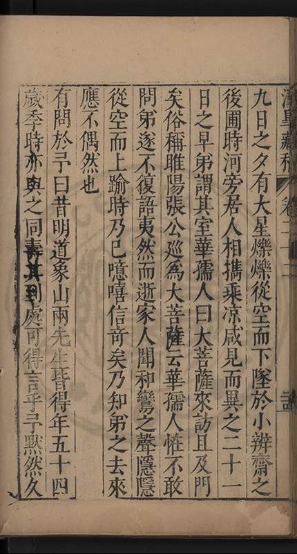 九日之夕有大星爍爍從空而下墜於小辨齋之後圃時河旁居人相擕乘涼咸見而異之二十一日之早弟謂其室華孺人曰大菩薩來訪且及門矣俗稱睢陽張公廵爲大菩薩云華孺人恠不敢問弟遂不復語夷然而逝家人聞和鸞之聲隱隱從空而上踰時乃已噫嘻信竒矣乃知弟之去來應不偶然也