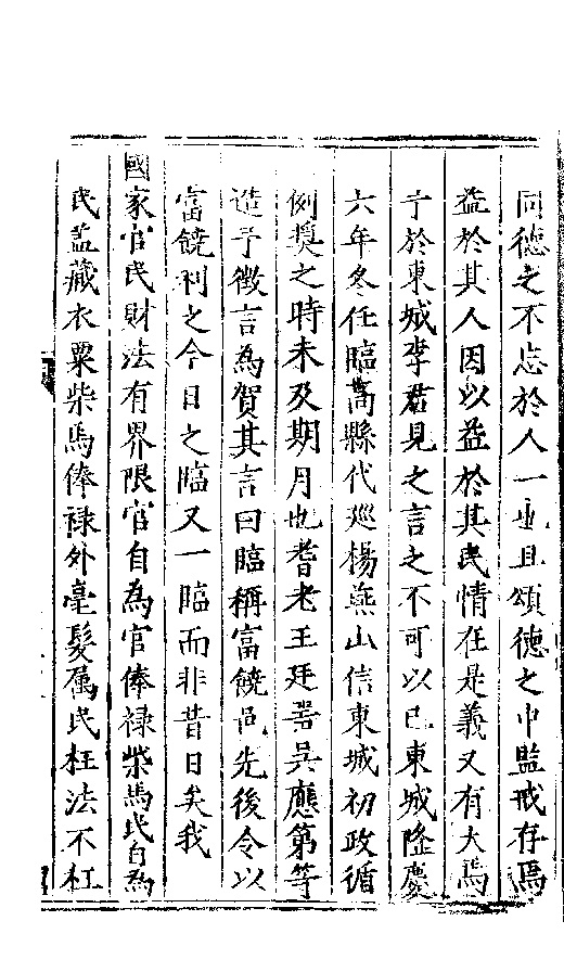 同德之不忘於人一也且頌德之中監戒存焉益於其人因以益於其民情在是義又有大焉予於東城李君見之言之不可以已東城隆慶六年冬任臨髙縣代巡楊燕山信東城初政循例奬之時未及期月也耆老王廷器吳應第等造予徴言為賀其言曰臨稱富饒邑先後令以富饒利之今日之臨又一臨而非昔日矣我國家官民財法有界限官自為官俸禄柴馬民自為民蓋藏衣粟柴馬俸禄外毫髮屬民枉法不枉