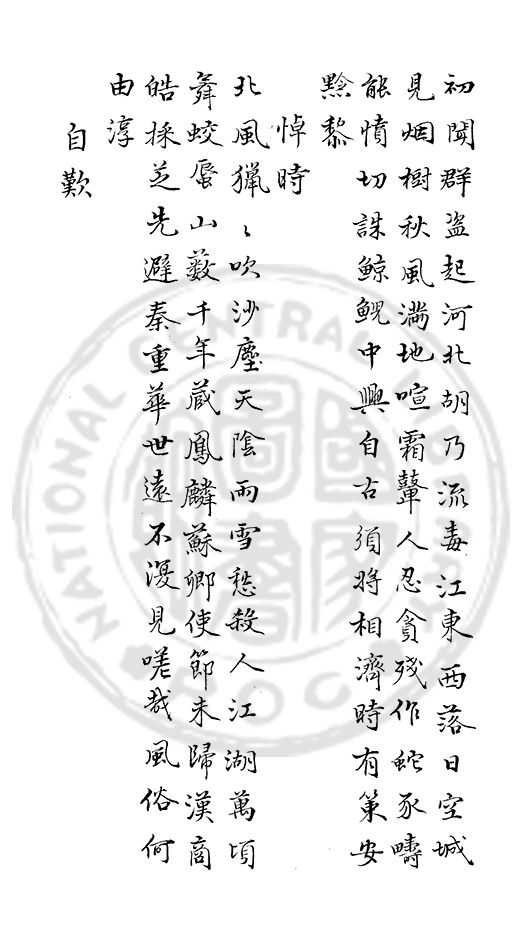 吟岸白綸擁麾思宿將伏闕憶忠臣何日梟群