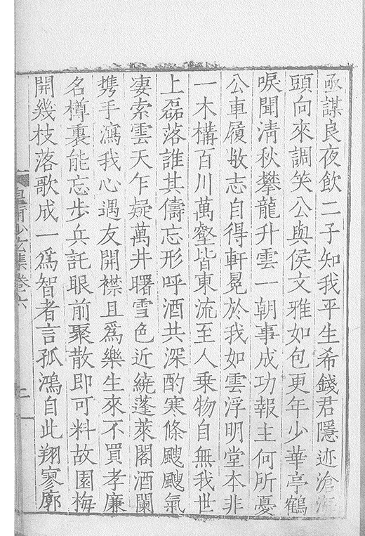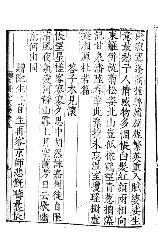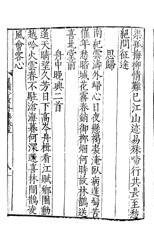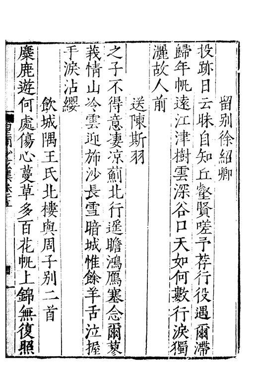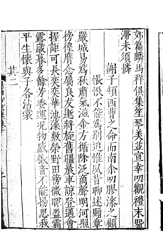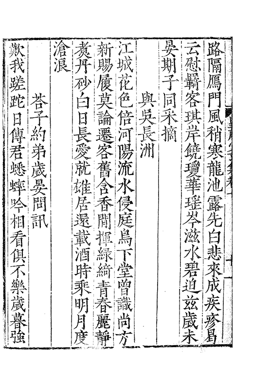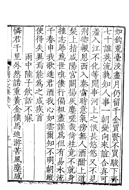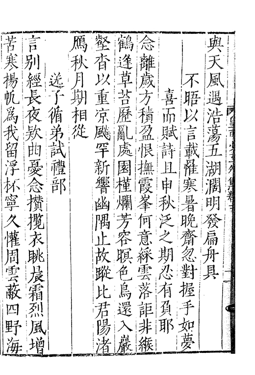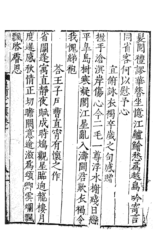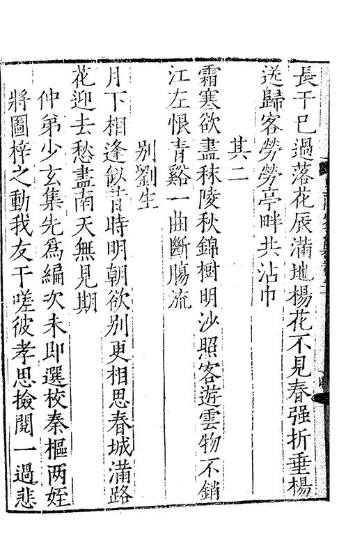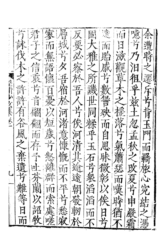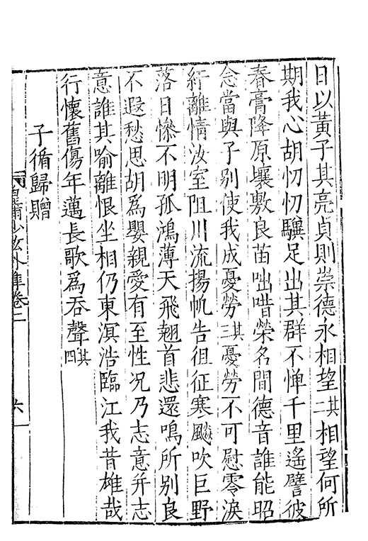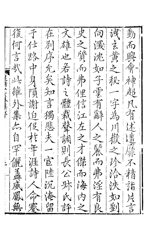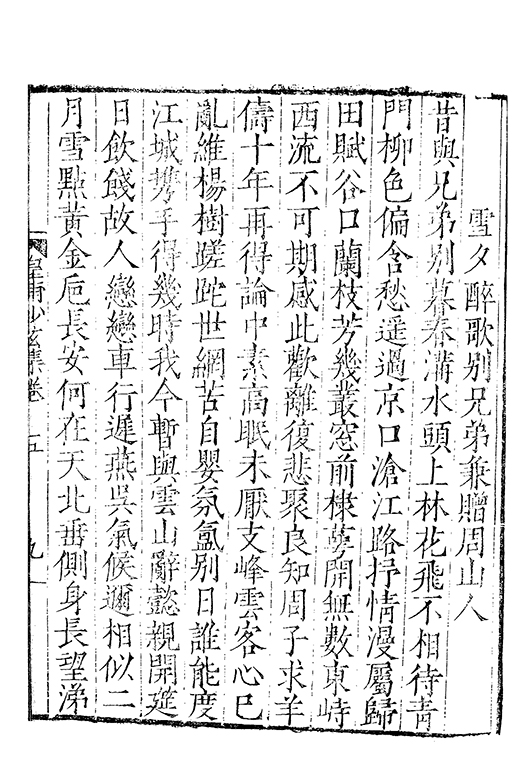 未有知者及既蒙嘉運矯迹崇賢稍與時軰相逐然終非其好盖自居先大夫憂巳盡詘時品而獨持上躅矣夫精于義者不繫乎物知所止者不同于流而彼竊小知以附閎議其奈之何今試舉其一二如雪意煩辭髪江流倩浣膓如啣魚上水鳥驚燕落橋花類皆少陵之靡妙雖集多不載猶可別傳兄嘗同為秋讌寒夜之作許與