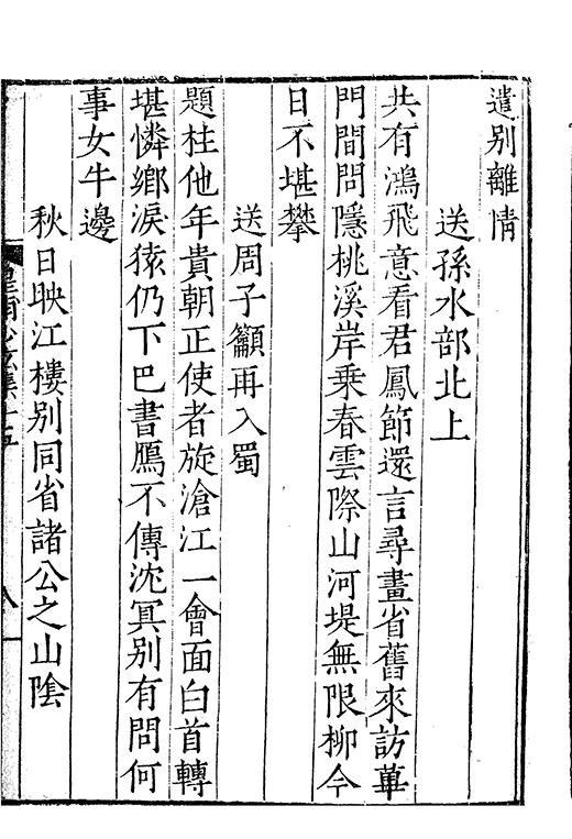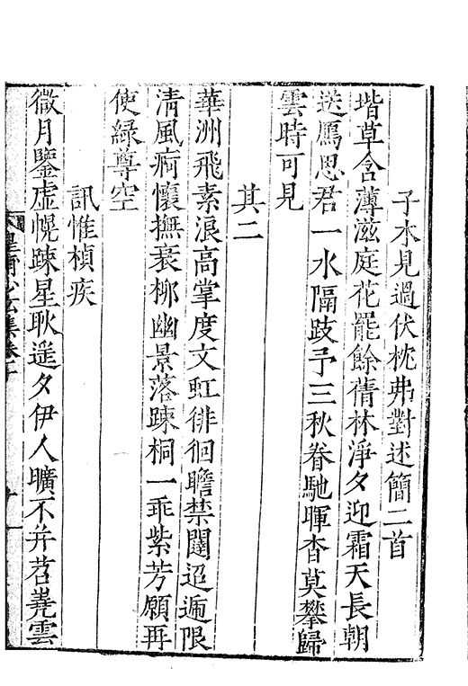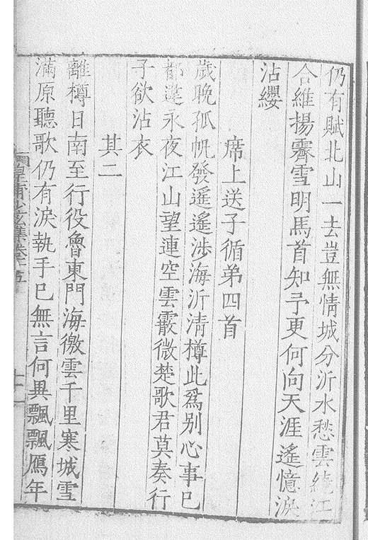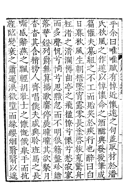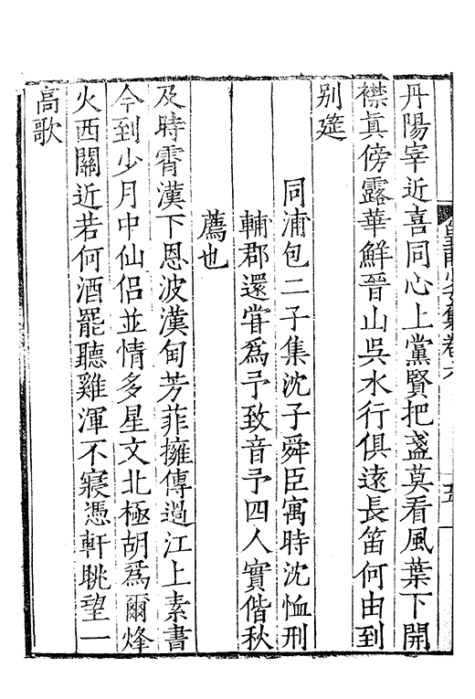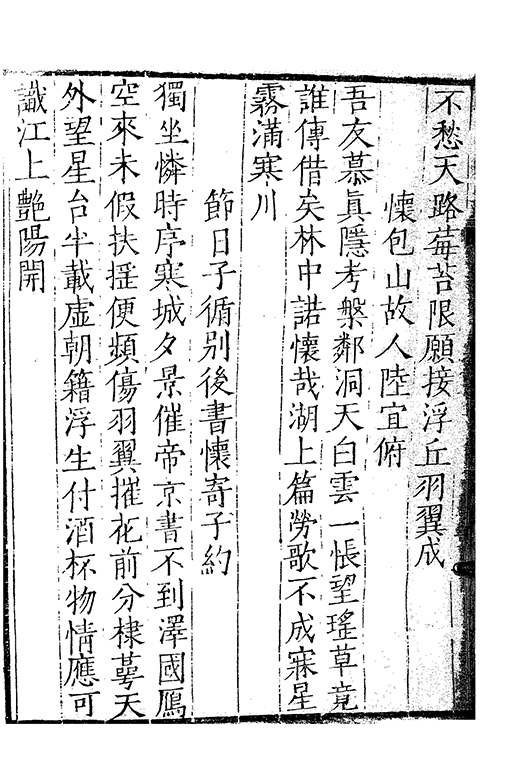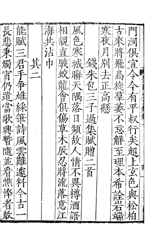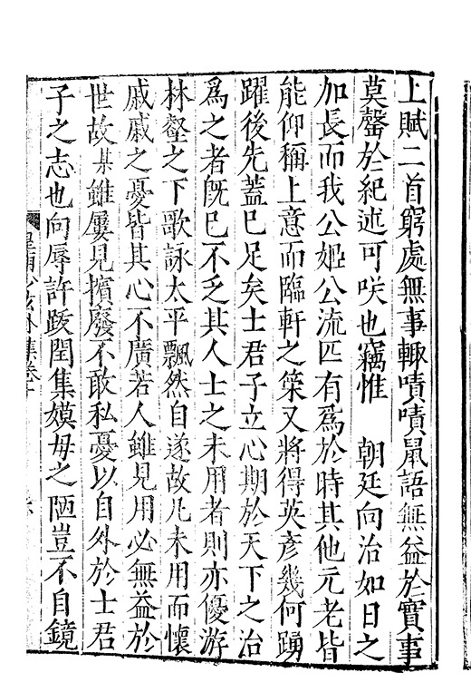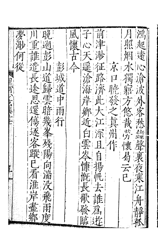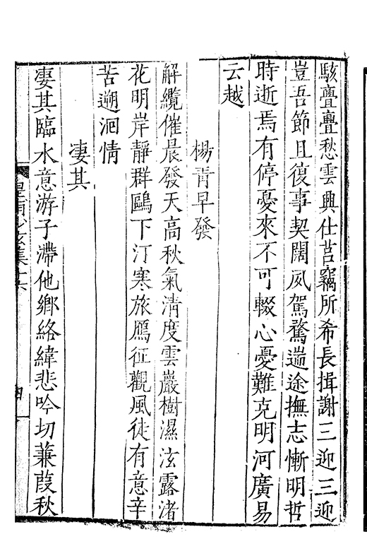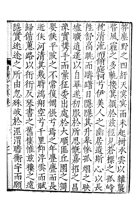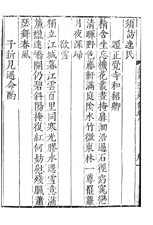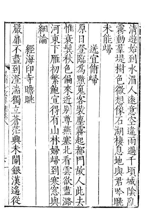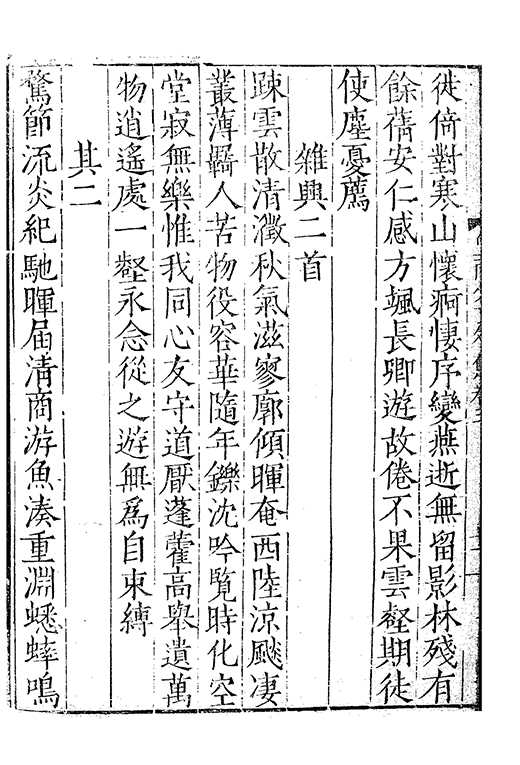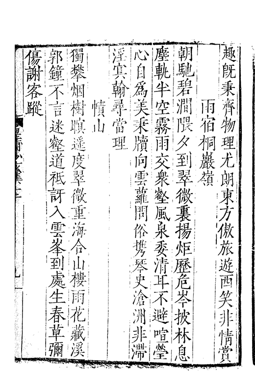 未有知者及既蒙嘉運矯迹崇賢稍與時軰相逐然終非其好盖自居先大夫憂巳盡詘時品而獨持上躅矣夫精于義者不繫乎物知所止者不同于流而彼竊小知以附閎議其奈之何今試舉其一二如雪意煩辭髪江流倩浣膓如啣魚上水鳥驚燕落橋花類皆少陵之靡妙雖集多不載猶可別傳兄嘗同為秋讌寒夜之作許與