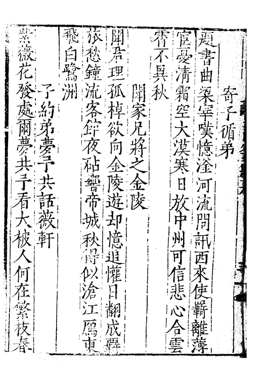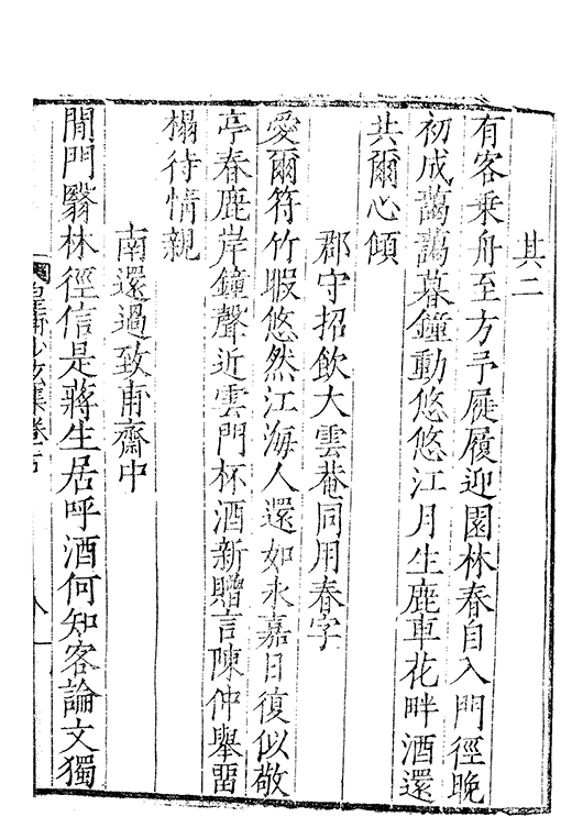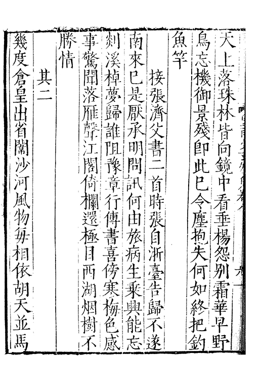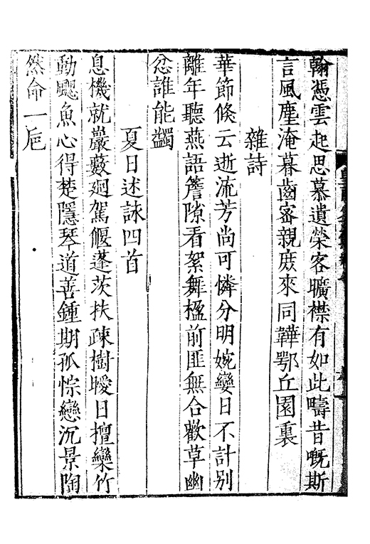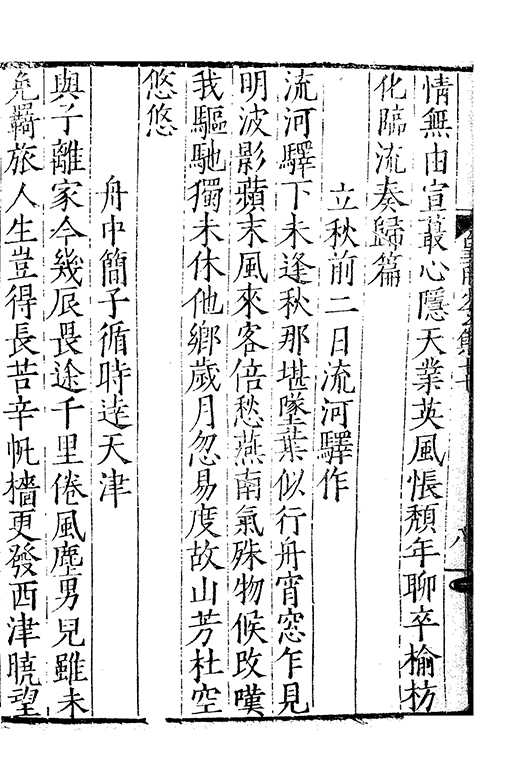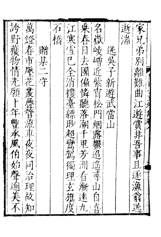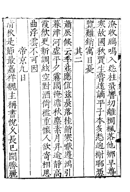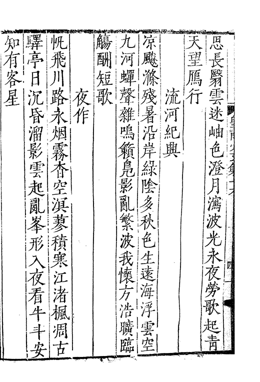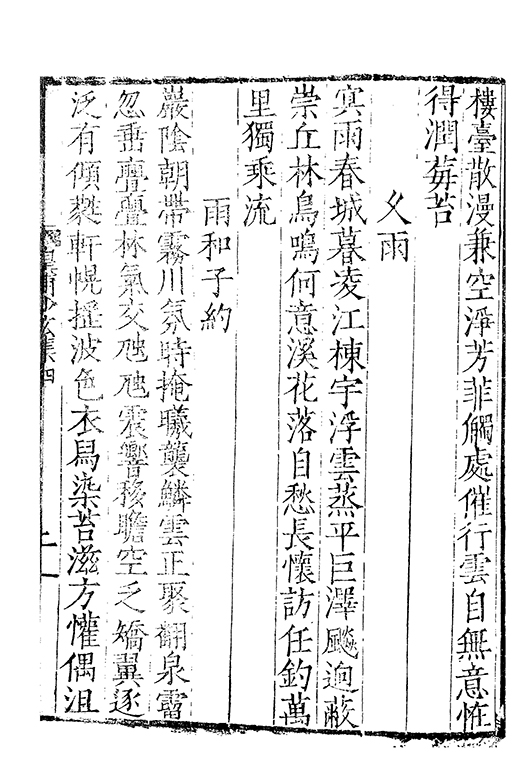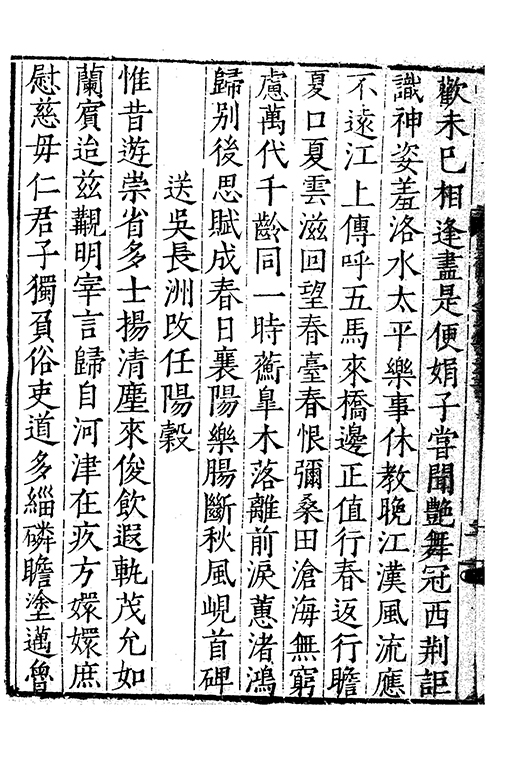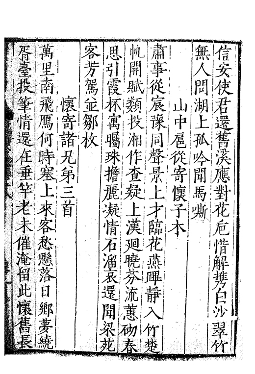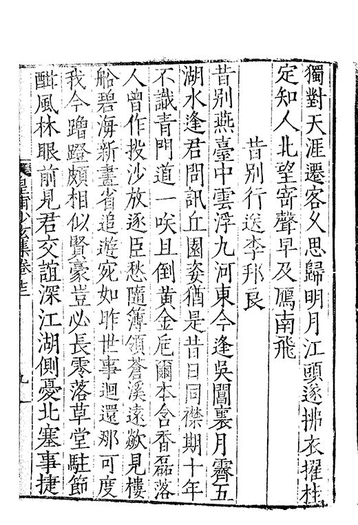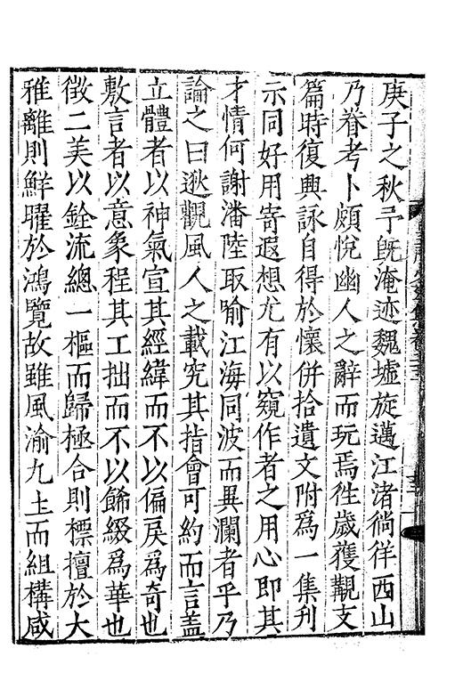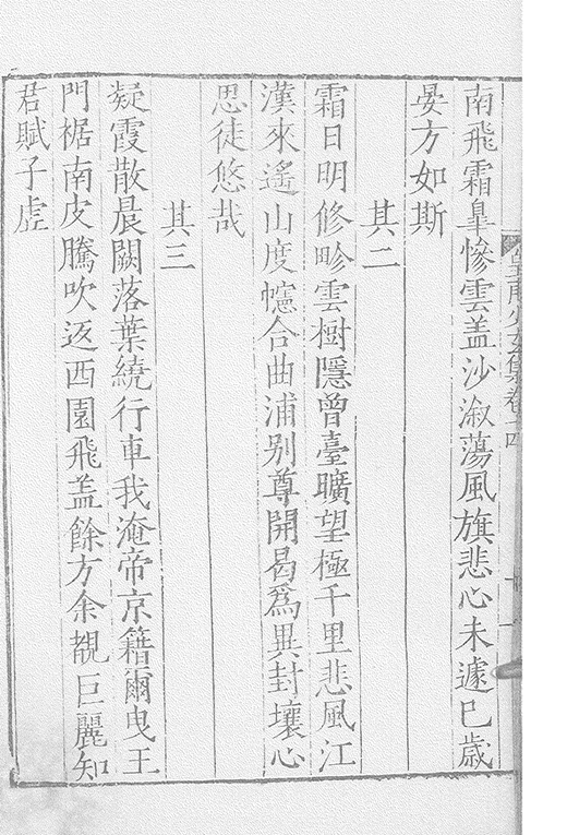 未有知者及既蒙嘉運矯迹崇賢稍與時軰相逐然終非其好盖自居先大夫憂巳盡詘時品而獨持上躅矣夫精于義者不繫乎物知所止者不同于流而彼竊小知以附閎議其奈之何今試舉其一二如雪意煩辭髪江流倩浣膓如啣魚上水鳥驚燕落橋花類皆少陵之靡妙雖集多不載猶可別傳兄嘗同為秋讌寒夜之作許與