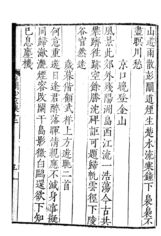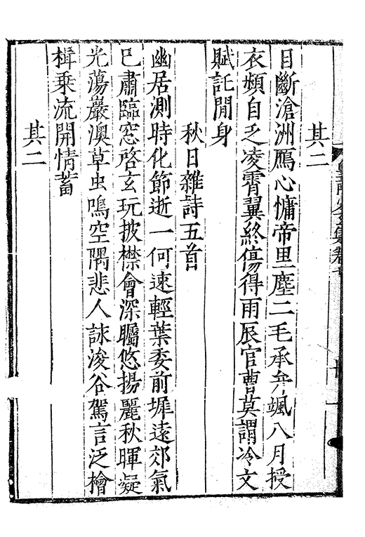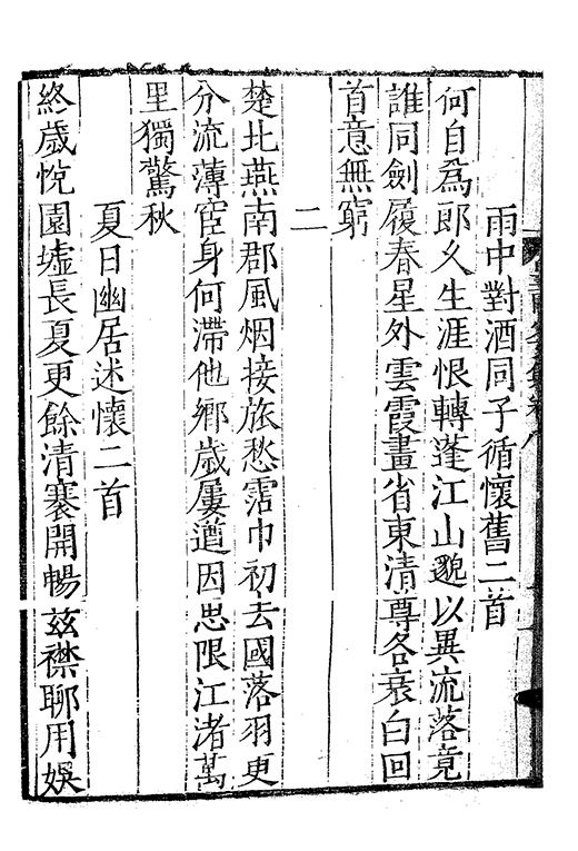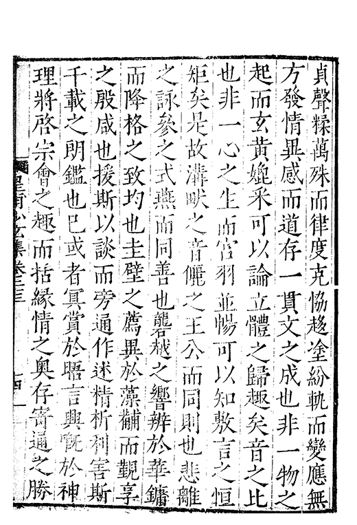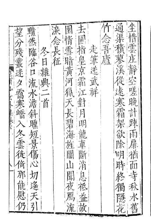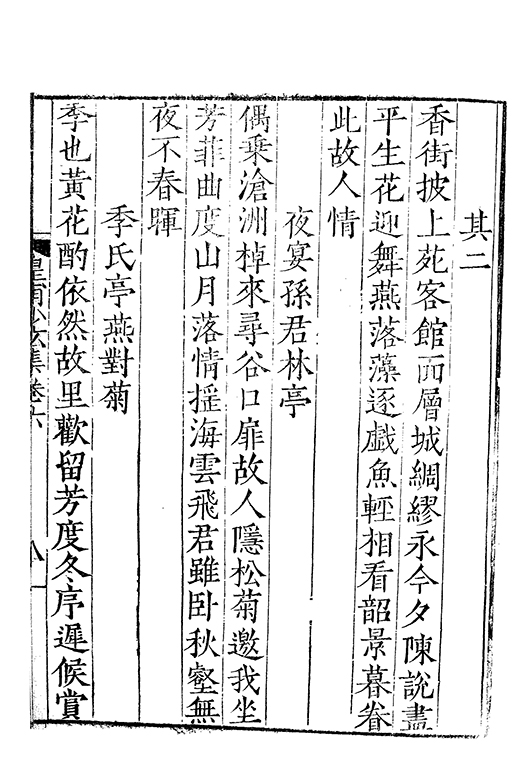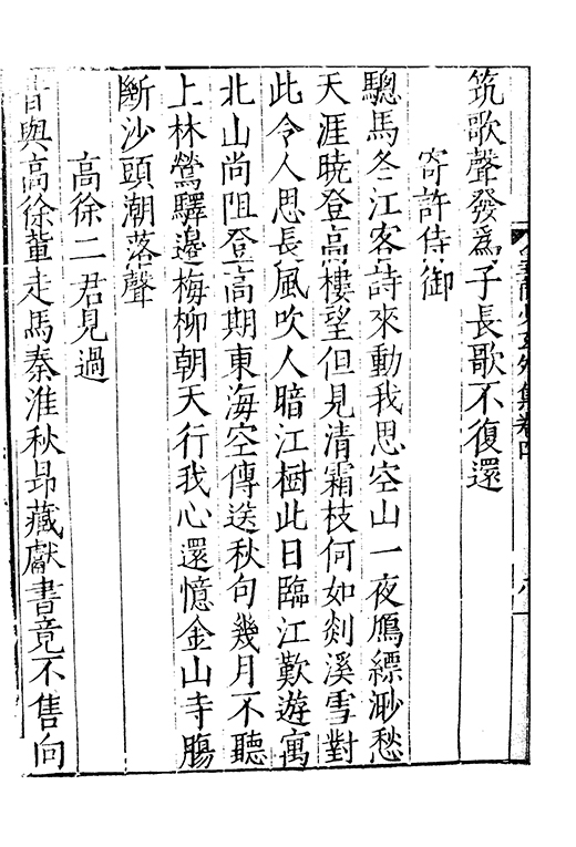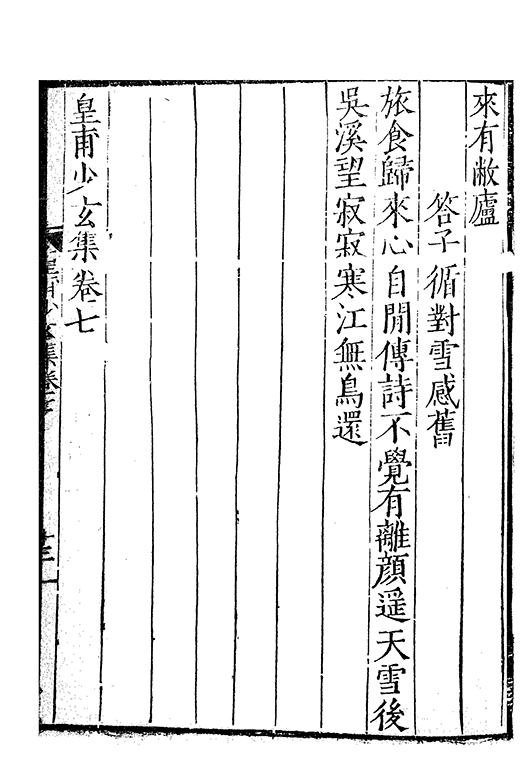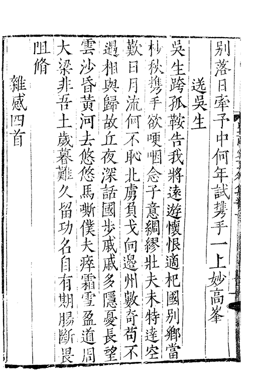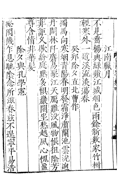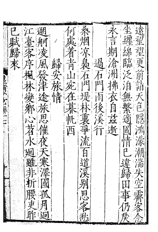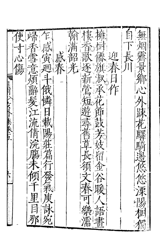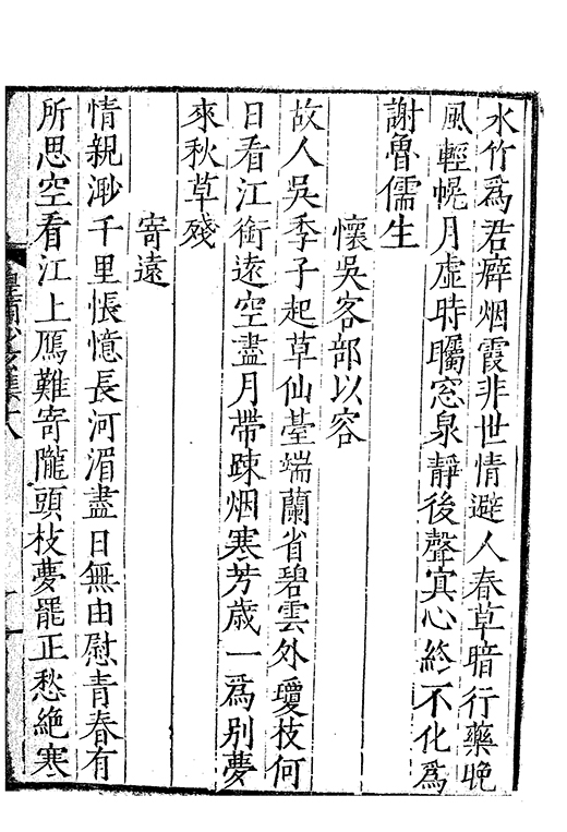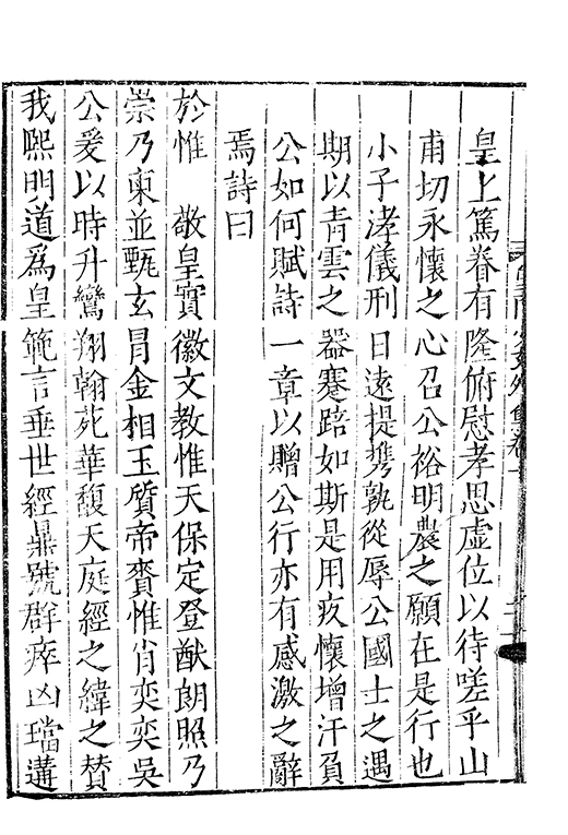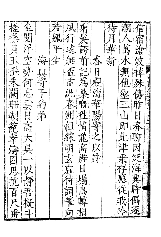 未有知者及既蒙嘉運矯迹崇賢稍與時軰相逐然終非其好盖自居先大夫憂巳盡詘時品而獨持上躅矣夫精于義者不繫乎物知所止者不同于流而彼竊小知以附閎議其奈之何今試舉其一二如雪意煩辭髪江流倩浣膓如啣魚上水鳥驚燕落橋花類皆少陵之靡妙雖集多不載猶可別傳兄嘗同為秋讌寒夜之作許與