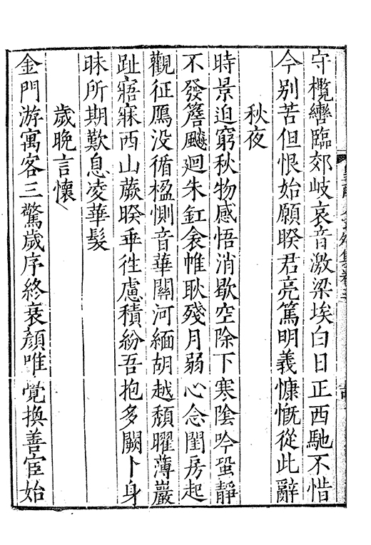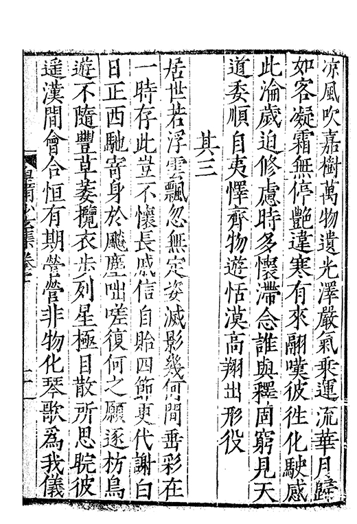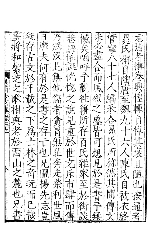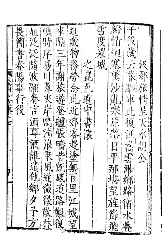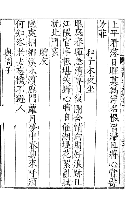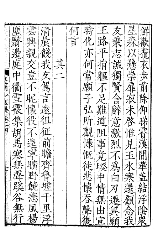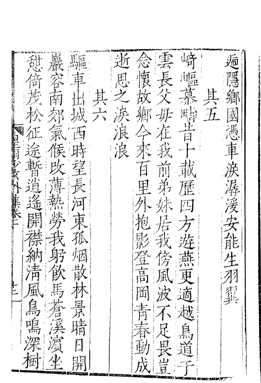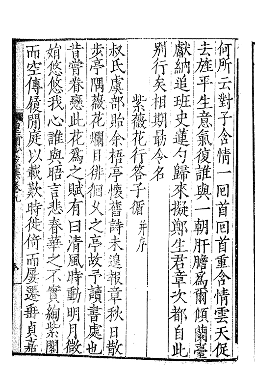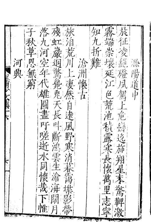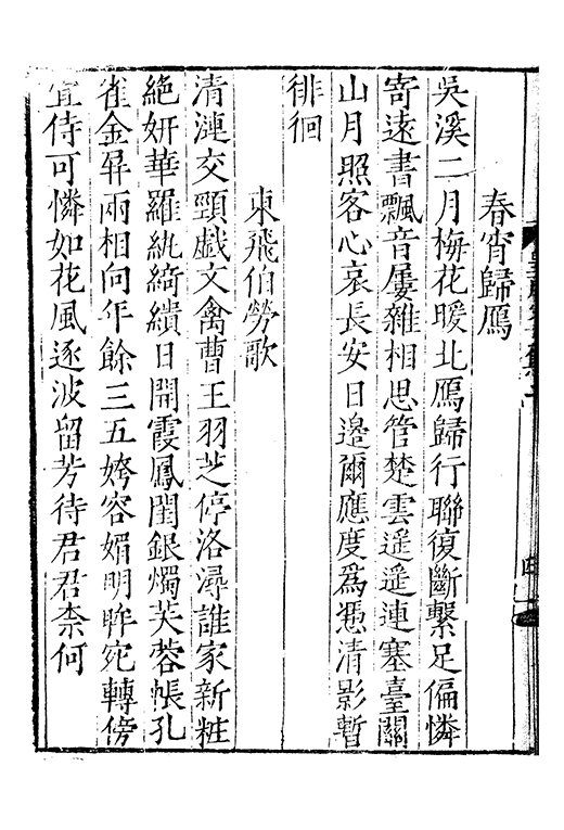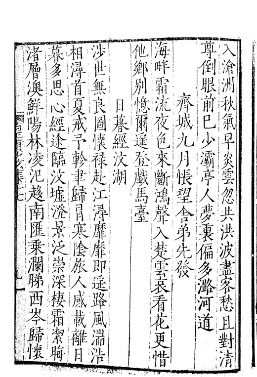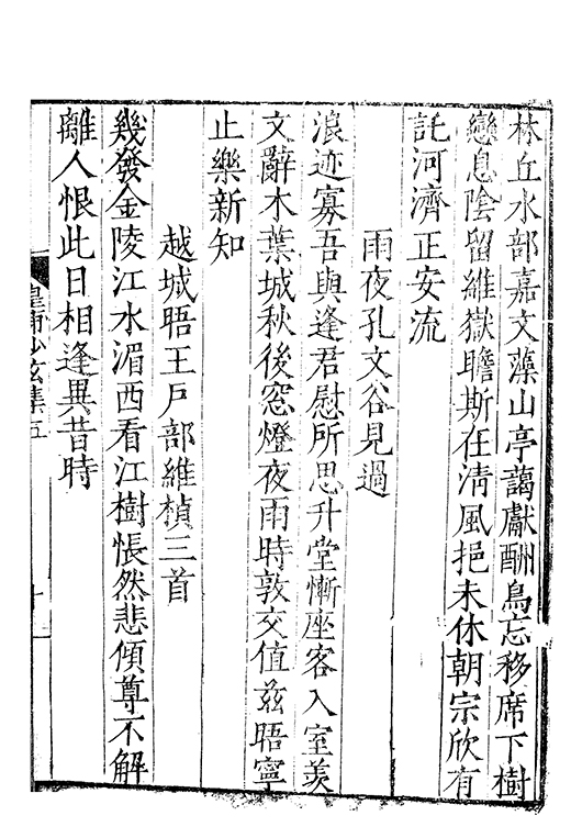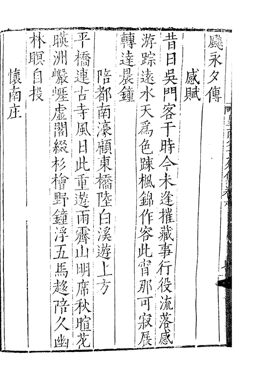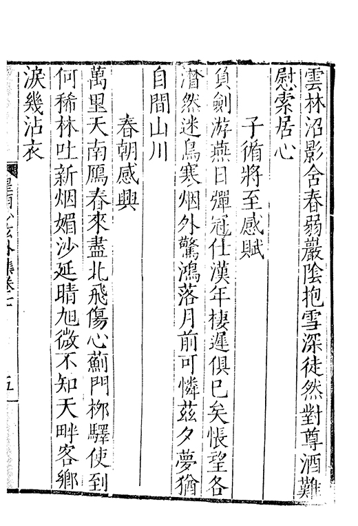 未有知者及既蒙嘉運矯迹崇賢稍與時軰相逐然終非其好盖自居先大夫憂巳盡詘時品而獨持上躅矣夫精于義者不繫乎物知所止者不同于流而彼竊小知以附閎議其奈之何今試舉其一二如雪意煩辭髪江流倩浣膓如啣魚上水鳥驚燕落橋花類皆少陵之靡妙雖集多不載猶可別傳兄嘗同為秋讌寒夜之作許與