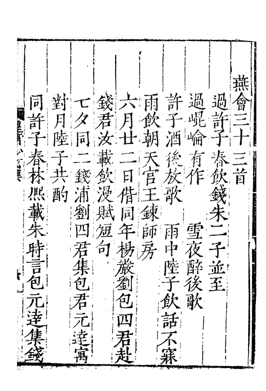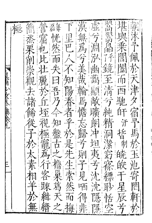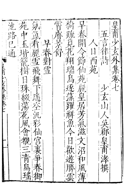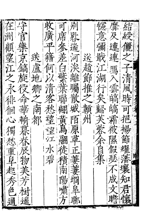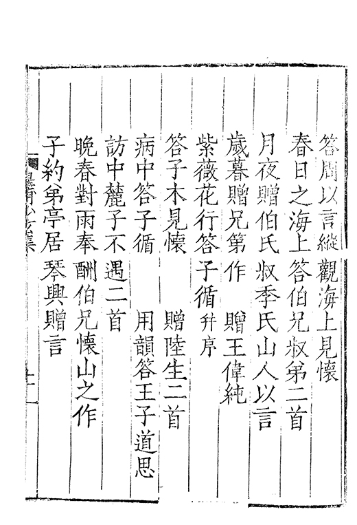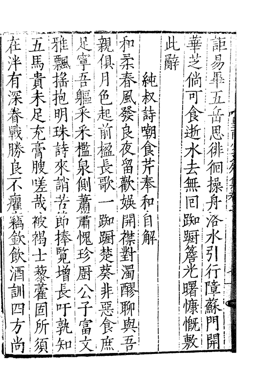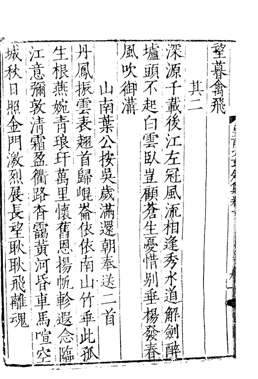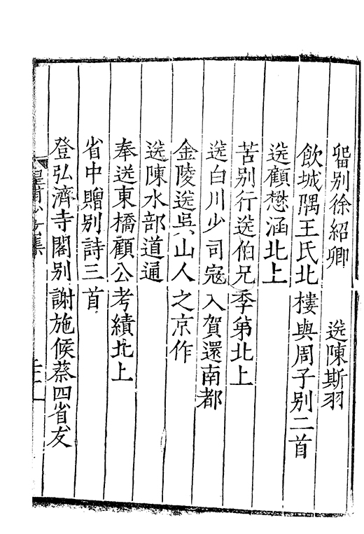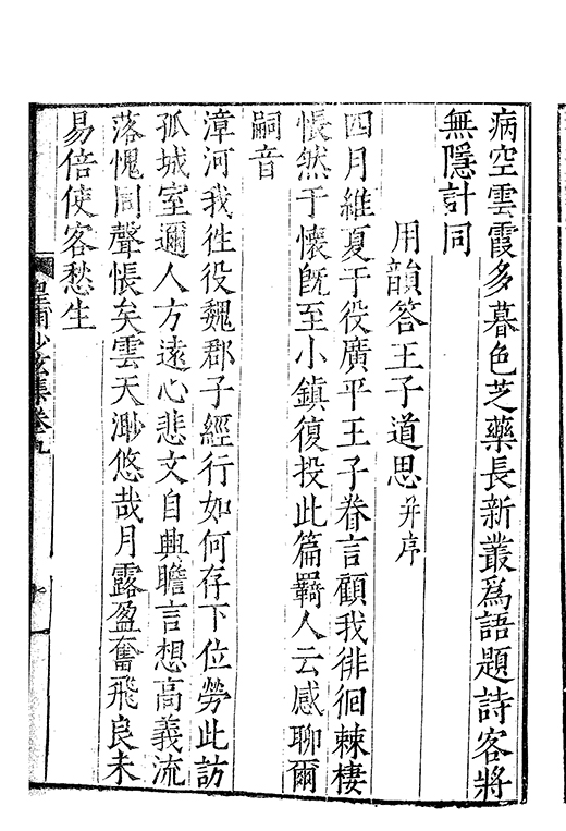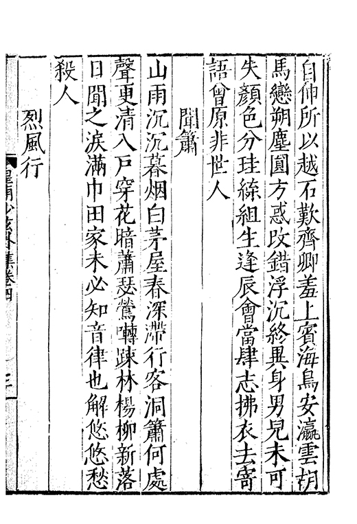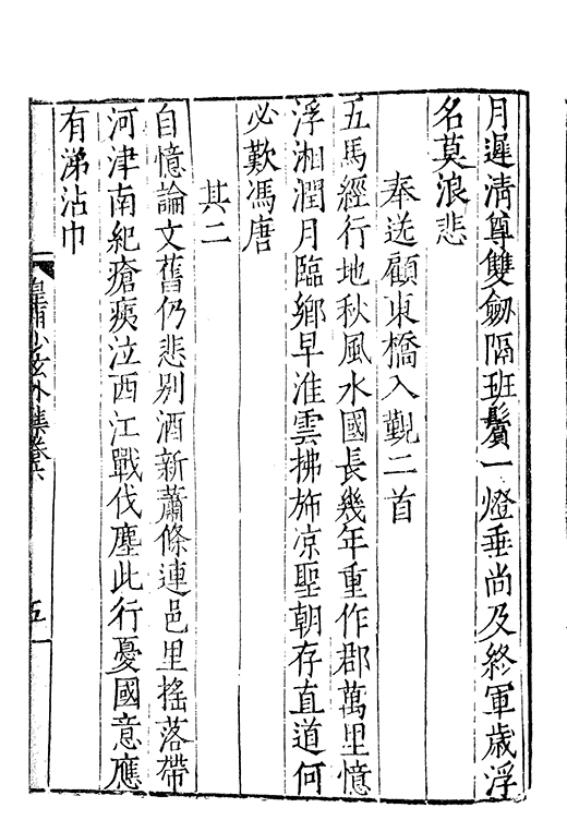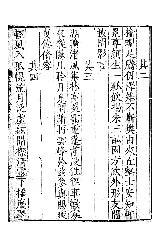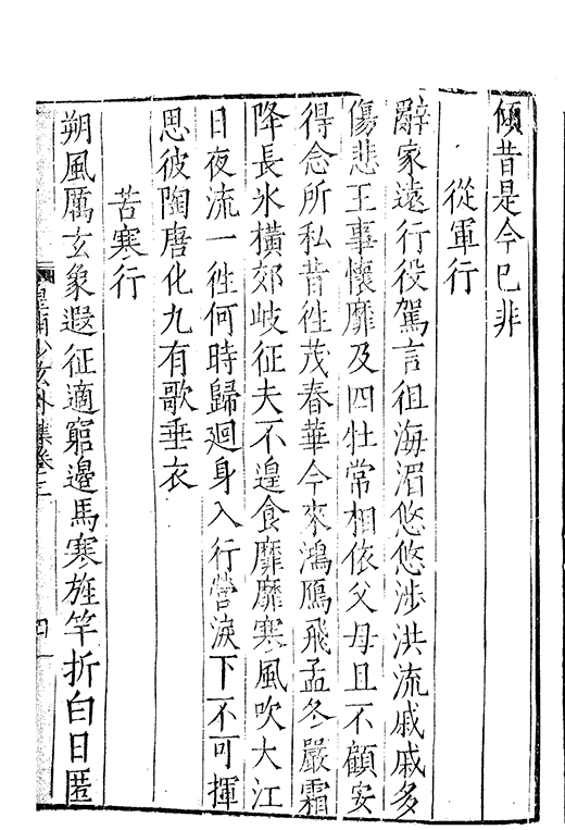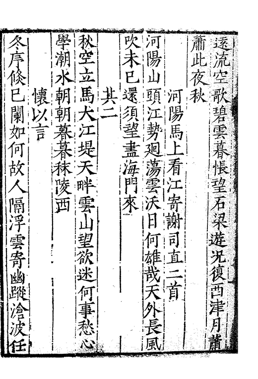 未有知者及既蒙嘉運矯迹崇賢稍與時軰相逐然終非其好盖自居先大夫憂巳盡詘時品而獨持上躅矣夫精于義者不繫乎物知所止者不同于流而彼竊小知以附閎議其奈之何今試舉其一二如雪意煩辭髪江流倩浣膓如啣魚上水鳥驚燕落橋花類皆少陵之靡妙雖集多不載猶可別傳兄嘗同為秋讌寒夜之作許與