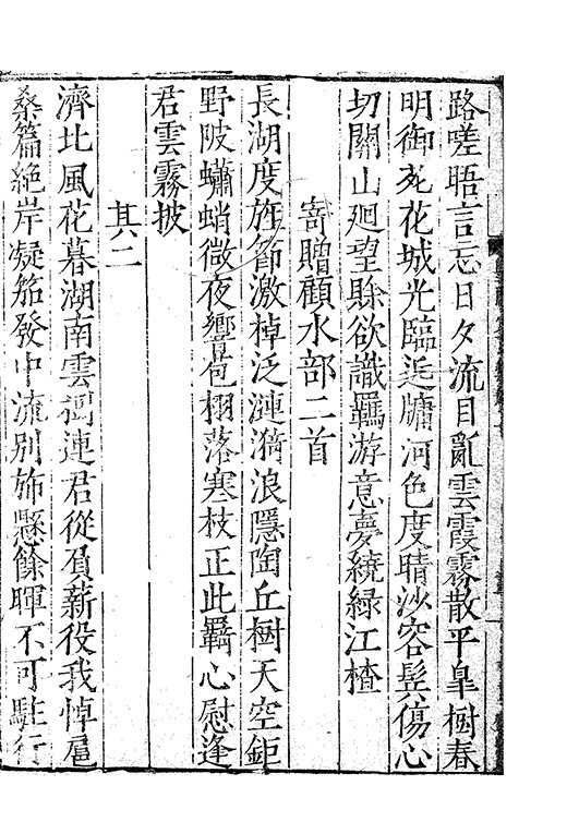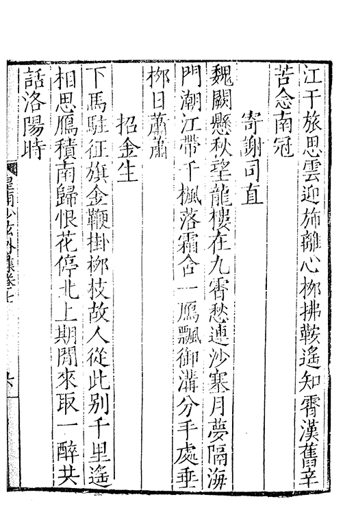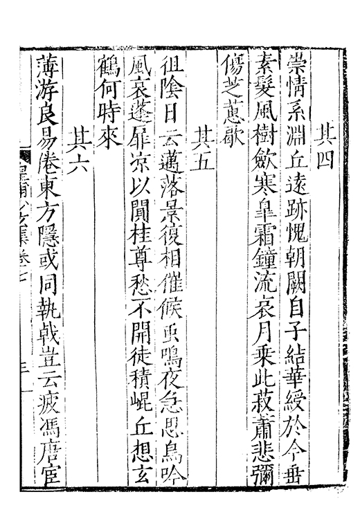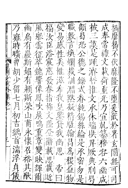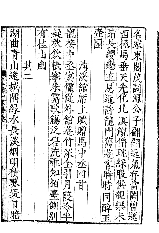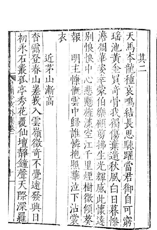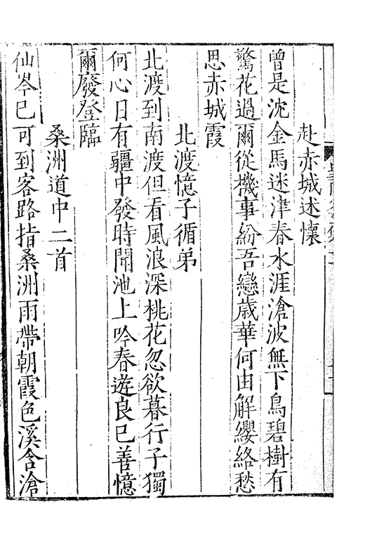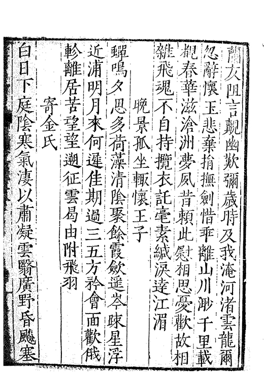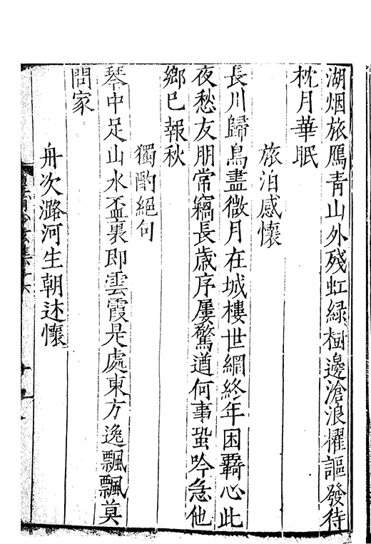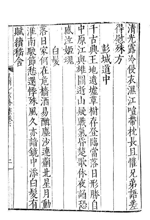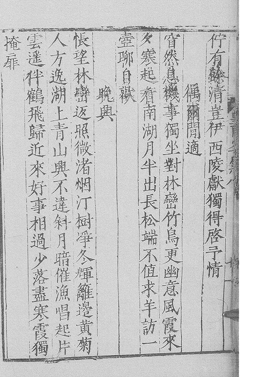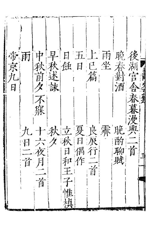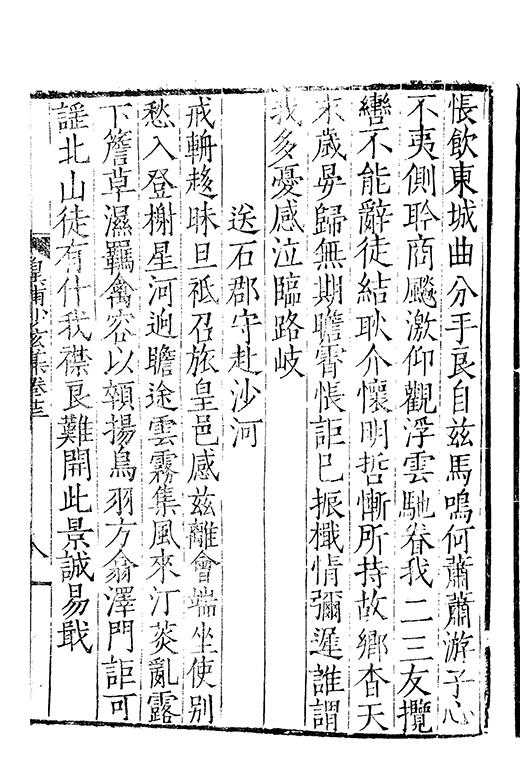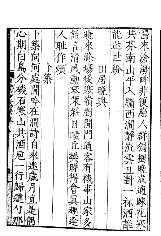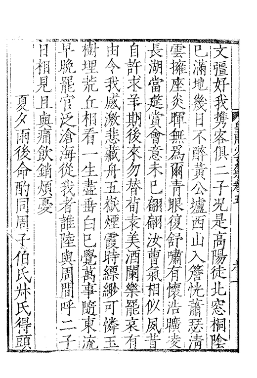 未有知者及既蒙嘉運矯迹崇賢稍與時軰相逐然終非其好盖自居先大夫憂巳盡詘時品而獨持上躅矣夫精于義者不繫乎物知所止者不同于流而彼竊小知以附閎議其奈之何今試舉其一二如雪意煩辭髪江流倩浣膓如啣魚上水鳥驚燕落橋花類皆少陵之靡妙雖集多不載猶可別傳兄嘗同為秋讌寒夜之作許與