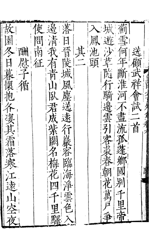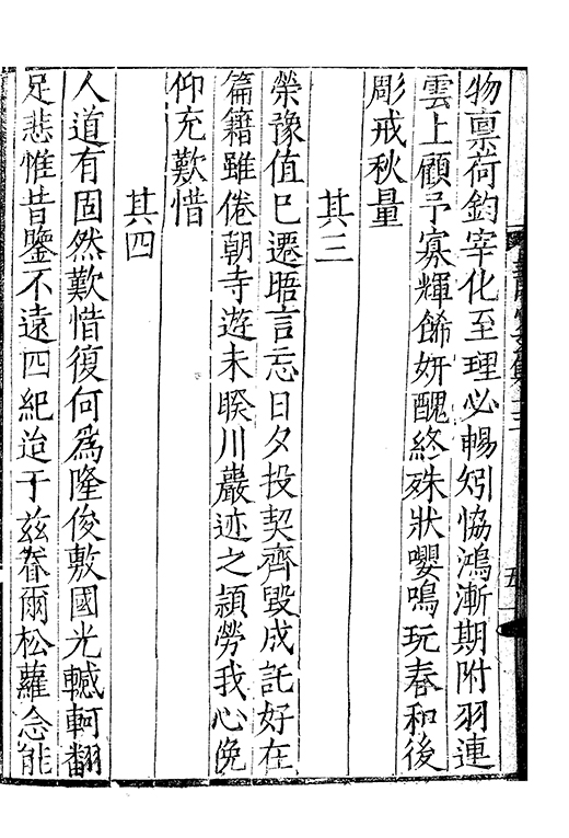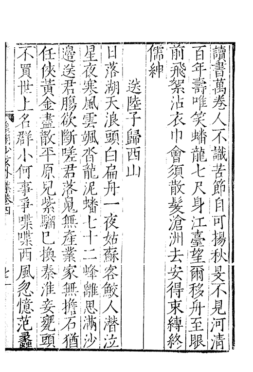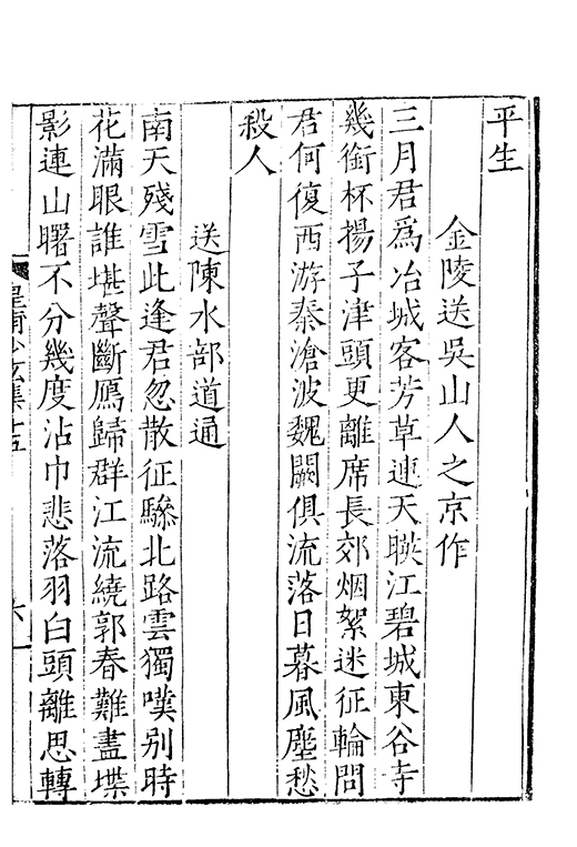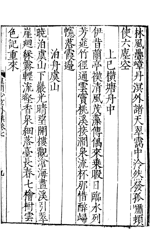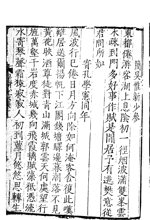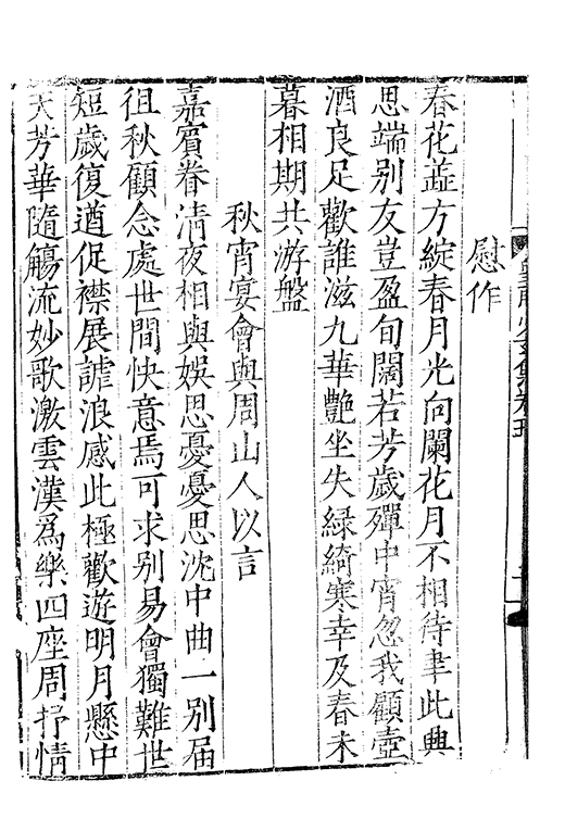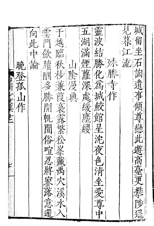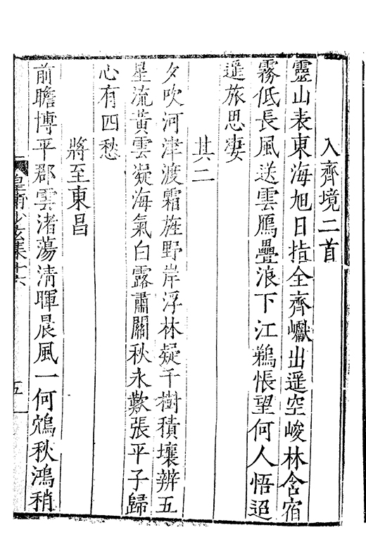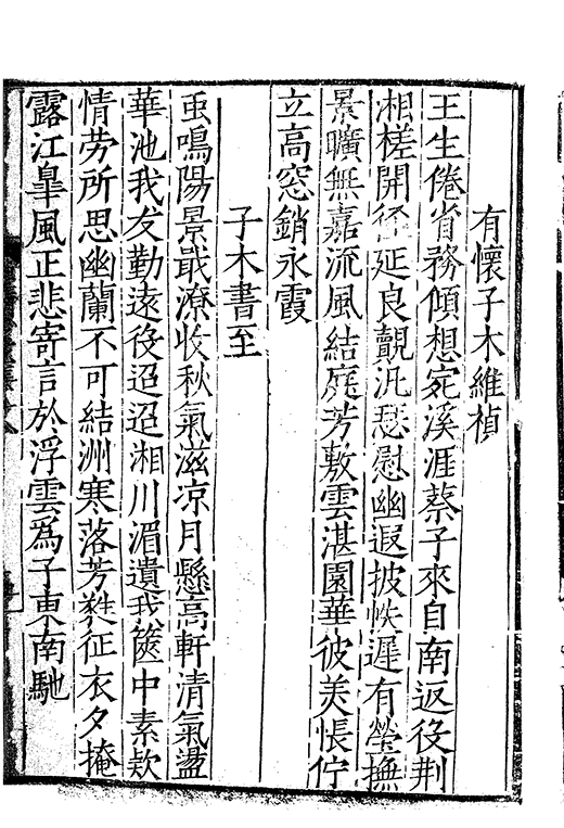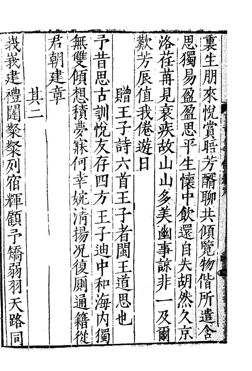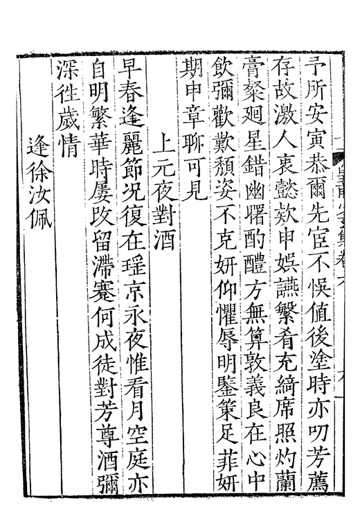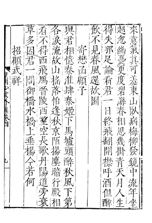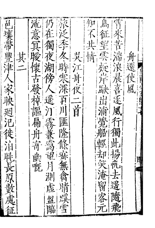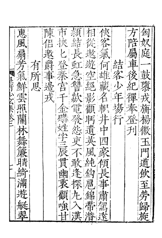 未有知者及既蒙嘉運矯迹崇賢稍與時軰相逐然終非其好盖自居先大夫憂巳盡詘時品而獨持上躅矣夫精于義者不繫乎物知所止者不同于流而彼竊小知以附閎議其奈之何今試舉其一二如雪意煩辭髪江流倩浣膓如啣魚上水鳥驚燕落橋花類皆少陵之靡妙雖集多不載猶可別傳兄嘗同為秋讌寒夜之作許與