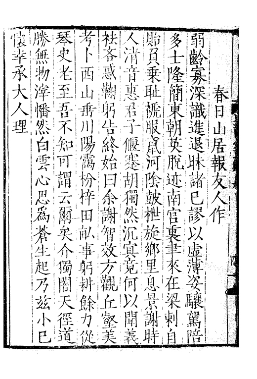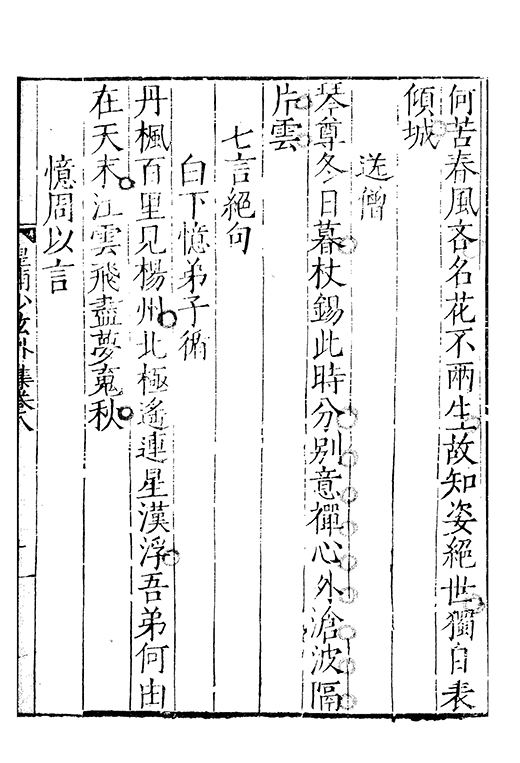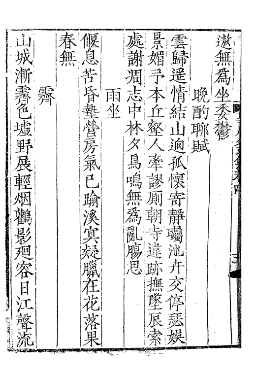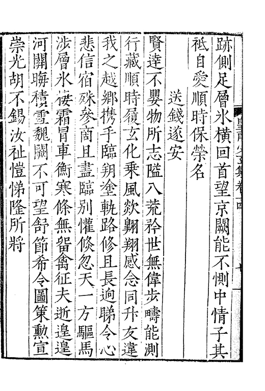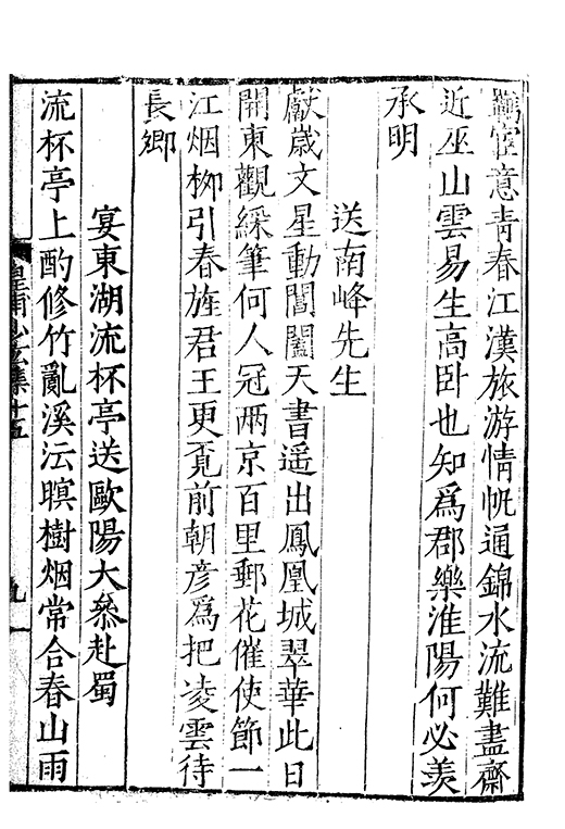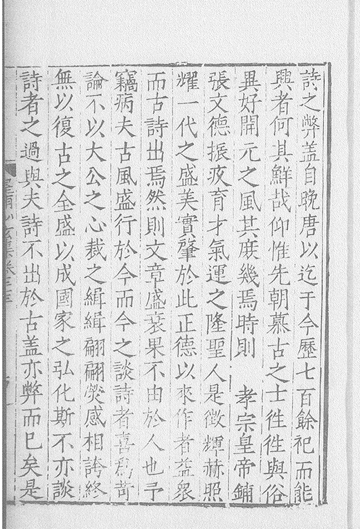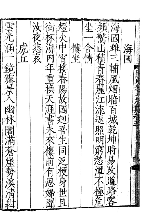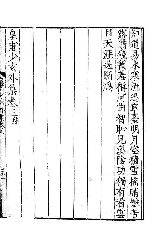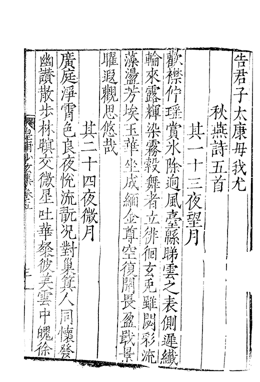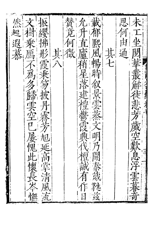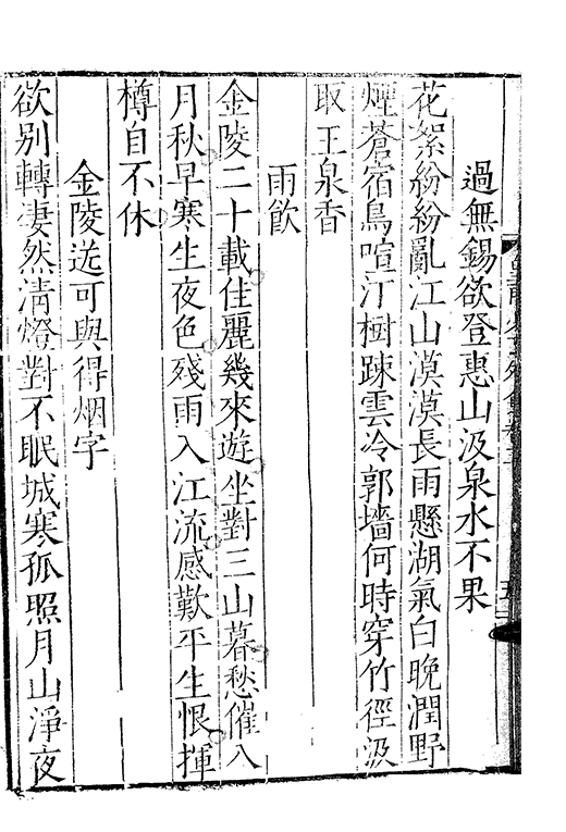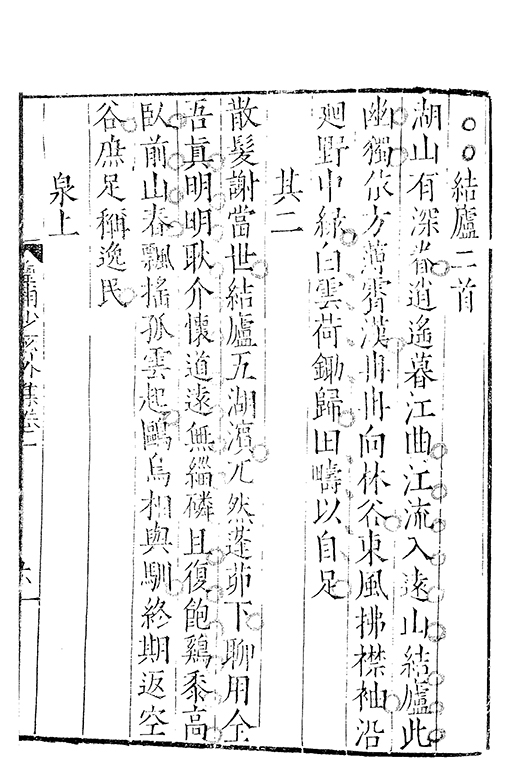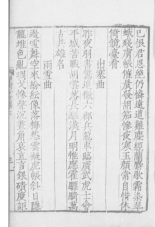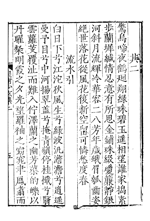 未有知者及既蒙嘉運矯迹崇賢稍與時軰相逐然終非其好盖自居先大夫憂巳盡詘時品而獨持上躅矣夫精于義者不繫乎物知所止者不同于流而彼竊小知以附閎議其奈之何今試舉其一二如雪意煩辭髪江流倩浣膓如啣魚上水鳥驚燕落橋花類皆少陵之靡妙雖集多不載猶可別傳兄嘗同為秋讌寒夜之作許與