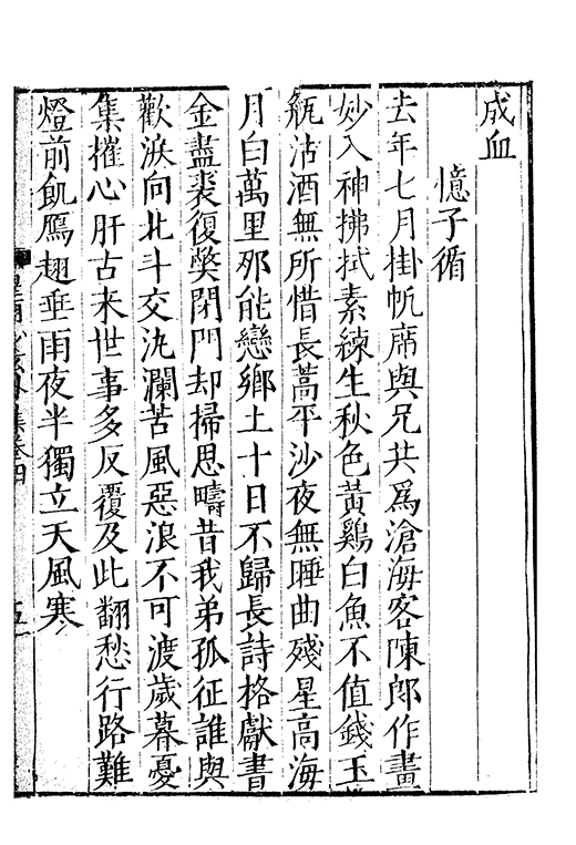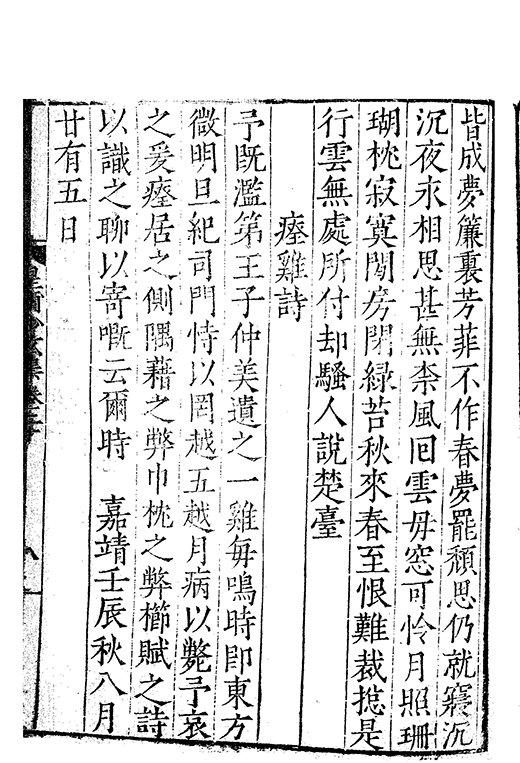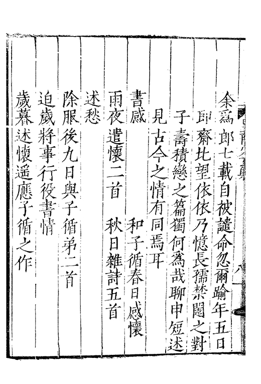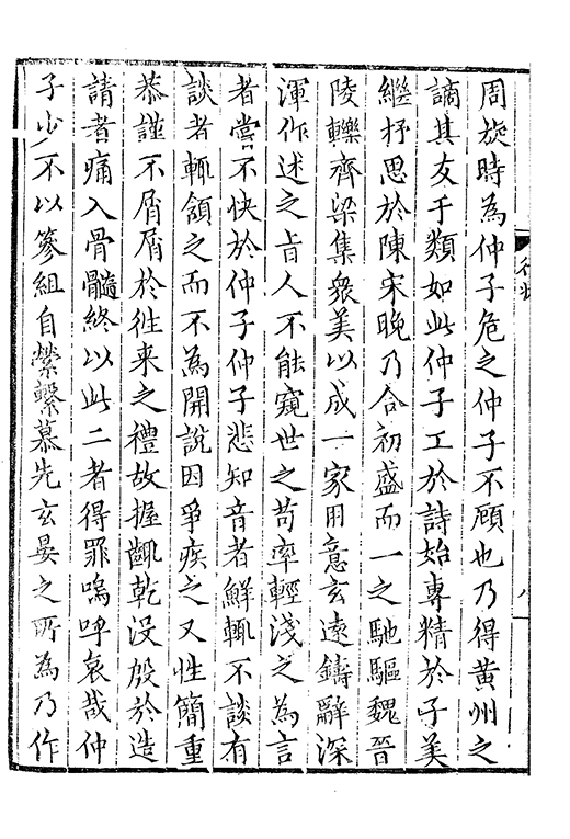 周旋時為仲子危之仲子不顧也乃得黃州之謫其友于類如此仲子工於詩始專精於子美繼抒思於陳宋晚乃合初盛而一之馳驅魏晉陵轢齊梁集衆美以成一家用意玄遠鑄辭深渾作述之旨人不能窺世之苟率輕淺之為言者嘗不快於仲子仲子悲知音者鮮輒不談有談者輒頷之而不為開說因爭疾之又性簡重恭謹不屑屑於徃來之禮故握輒乾沒殷於造請者痛入骨髓終以此二者得罪嗚呼哀哉仲子少不以蔘組自縈繫慕先玄晏之所為乃作