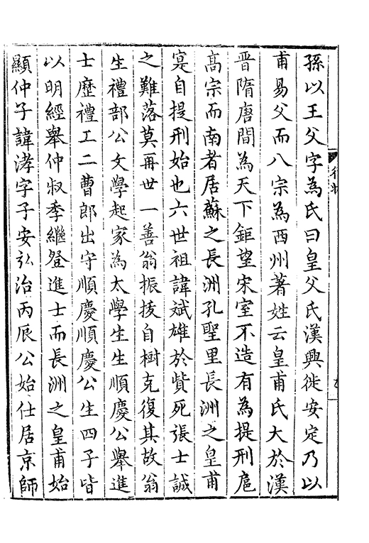 孫以王父字為氏曰皇父氏漢興徙安定乃以甫易父而八宗為西州著姓云皇甫氏大於漢晉隋唐間為天下鉅望宋室不造有為提刑扈高宗而南者居蘇之長洲孔聖里長洲之皇甫寔自提刑始也六世祖諱斌雄於貲死張士誠之難落寞再世一善翁振拔自樹克復其故翁生禮部公文學起家為太學生生順慶公舉進士歷禮工二曹郎出守順慶順慶公生四子皆以明經舉仲叔季繼登進士而長洲之皇甫始顯仲子諱涍字子安弘治丙辰公始仕居京師