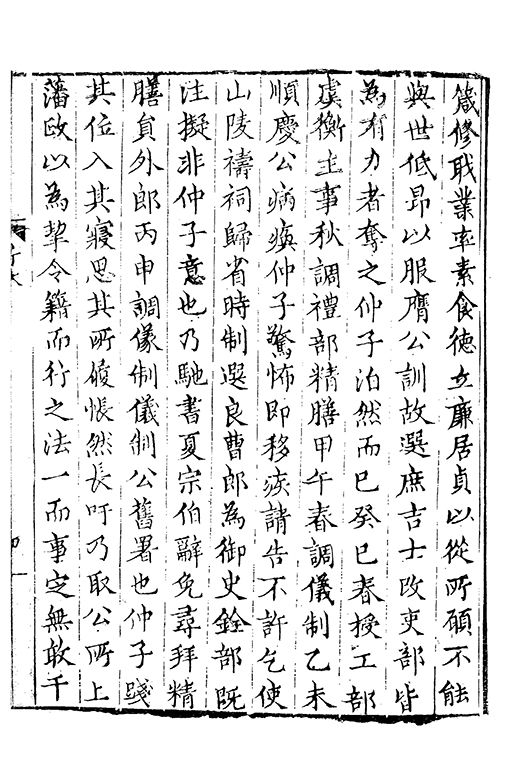箴修聀業率素食德立廉居貞以從所顧不能與世低昂以服膺公訓故選庶吉士改吏部皆為有力者奪之仲子泊然而已癸巳春授工部虞衡生事秋調禮部精膳甲午春調儀制乙未順慶公病瘓仲子驚怖即移疾請告不許乞使山陵禱祠歸省時制遐良曹郎為御史銓部既注擬非仲子意也乃馳書夏宗伯辭免尋拜精膳員外郎丙申調儀制儀制公舊署也仲子踐其位入其寢思其所履悵然長吁乃取公所上藩改以為挈令籍而行之法一而事□無敢千