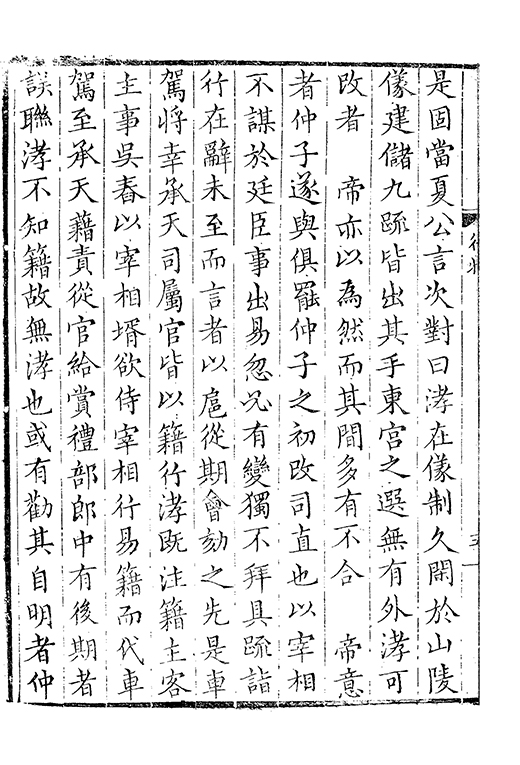 是固當夏公言次對曰涍在儀制久閑於山陵儀建儲九疏皆出其乎東宮之選無有外涍可改者帝亦以為然而其間多有不合帝意者仲子遂與俱罷仲子之初改司直也以宰相不謀於廷臣事出易忽况有變獨不拜具疏詣行在辭未至而言者以扈從期會劾之先是車駕將幸承天司屬官皆以籍行涍既注籍主客主事吳春以宰相壻欲侍宰相行易籍而代車駕至承天藉責從官給賞禮部郎中有後期者□聮涍不知籍故無涍也或有勸其自明者仲