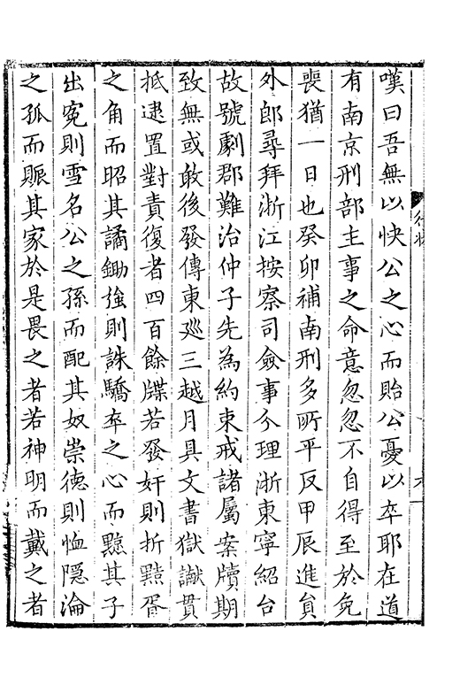 嘆曰吾無以快公之心而貽公憂以卒耶在道有南京刑部主事之命意忽忽不自得至於免喪猶一日也癸卯補南刑多所平反甲辰進員外郎尋拜浙江按察司僉事今理浙東寧紹台故號劇郡難治仲子先為約束戒諸屬案牘期致無或敢後發傳東廵三越月具文書獄讞貫抵逮置對責復者四百餘牒若發奸則折點胥之角而昭其譎鋤強則誅驕卒之心而點其子出冤則雪名公之孫而配其奴崇德則恤隱淪之孤而賑其家於是畏之者若神明而戴之者