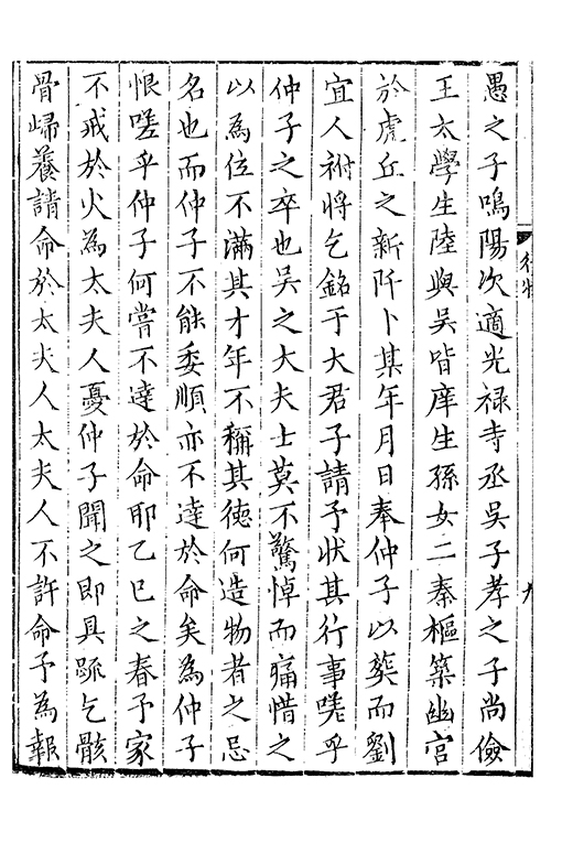 愚之子鳴陽次適光祿寺丞吳子孝之子尚儉王太學生陸與吳皆庠生孫女二秦樞築幽官於虎丘之新阡卜某年月日奉仲子以葬而劉宜人祔將乞銘于大君子請予狀其行事嗟乎仲子之卒也吳之大夫士莫不驚悼而痛惜之以為位不滿其才年不稱其徳何造物者之忌名也而仲子不能委順亦不達於命矣為仲子恨嗟乎仲子何嘗不達於命耶乙巳之春予家不戒於火為太夫人憂仲子聞之即具疏乞骸骨歸養請命於太夫人太夫人不許命予為報
