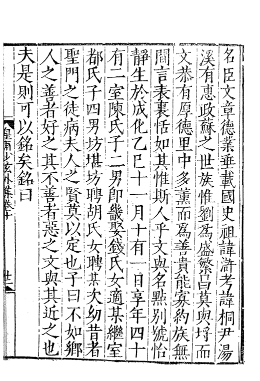 名臣文章德業垂載國史祖諱滸考諱桐尹湯溪有惠政蘇之世族惟劉為盛繁昌莫與埒而文恭有厚德里中多薰而為善貴能寡約族無間言表裏恬如其惟斯人乎文與名點别號怡靜生於成化乙巳十一月十有一日享年四十有二室陳氏子二男即畿娶錢氏女適某繼室都氏子四男坊堪坊聘胡氏女聘某次幼昔者聖門之徒病夫人之賢莫以定也子曰不如鄉人之善者好之其不善者惡之文與其近之也夫是則可以銘矣銘曰