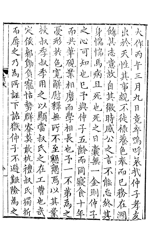 大作丙午三月九日竟卒嗚呼哀哉仲子孝友出於天性其事親不徙祿養色奉而已務在潤餘其志意故自其徽時感公之言不能忘終其身惴惴焉病且死也死之日囊無一金則仲子之心可知也已予與仲子五齡而同寢食十年而共筆硯業相磨而學相長也予一不弟為之憂形於色寬觧慰釋無所不至懇懇焉以其業授叔季叔季用之以顯當叔氏之在工曹也哉定侯郭勛負寵怙勢群寮莫敢抗禮叔氏獨折而辱之乃為所誣下詔獄仲子不避艱險為之