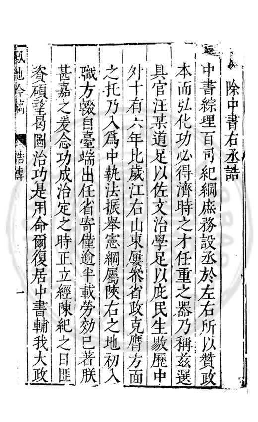 右轄之位往其居之於戲官必擇人人惟求舊公輔之任朕期爾乆矣爾尚益宣材力務展猷為設施酌乎古今經綸審於事體庶成勲績以副朕懷可