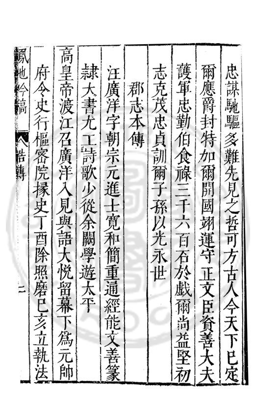 高皇帝渡江召廣洋入見與大悅留幕下為元帥府令史行樞密院掾史丁酉除照磨巳亥立執法