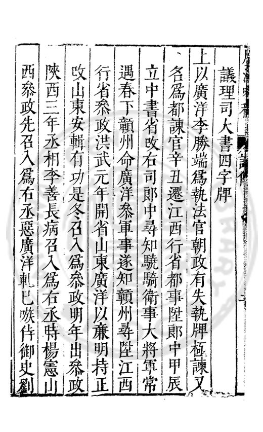 上以廣洋李勝端為執法官朝政有失執牌極諫又名為都諫官辛丑遷江西行省都事陞郎中甲辰立中書省改右司郎中尋驍騎衛事大將軍常遇春下贑州命廣洋參軍事遂知贛州尋陞江西行省參政洪武元年開省山東廣洋以廉明持正改山東安輯有功是冬召入為參政明年出參政陝西三年丞相李善長病召入為右丞時楊憲山西參政先召入為右丞惡廣洋軋已嗾侍御史劉