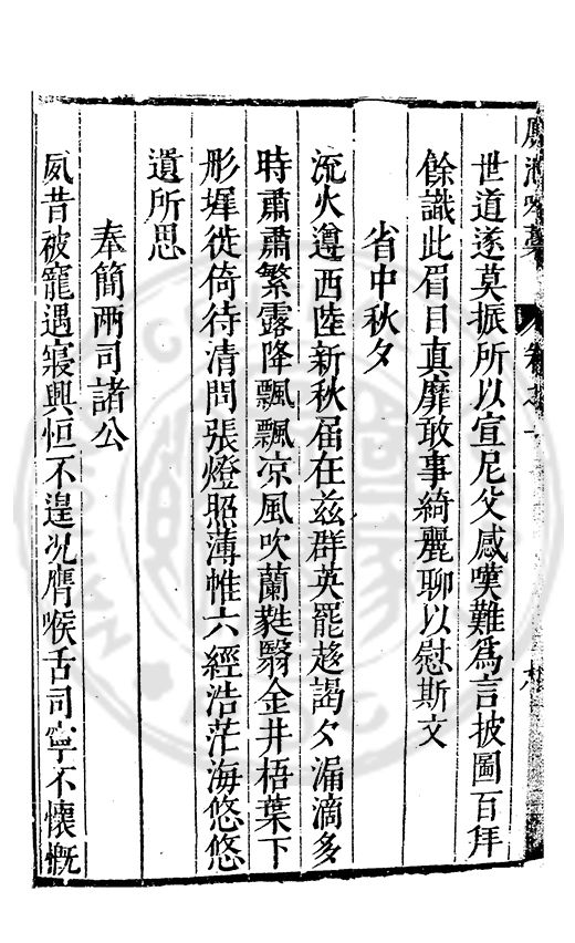 中書綜理百司紀綱庶務設丞於左右所以贊政本而弘化功必得濟時之材任重之器乃稱兹選具官汪某道足以佐文治學足以庇民生敭歴中外十有六年比歲江右山東屢叅省政克膺方面之託乃入為中執法振舉憲綱属陜右之地初入職方輟自臺端出任省寄僅逾半載勞効已著朕甚嘉之爰念功成治定之時正立綱陳紀之日匪資碩望曷圖治功是用命爾復居中書輔我大政