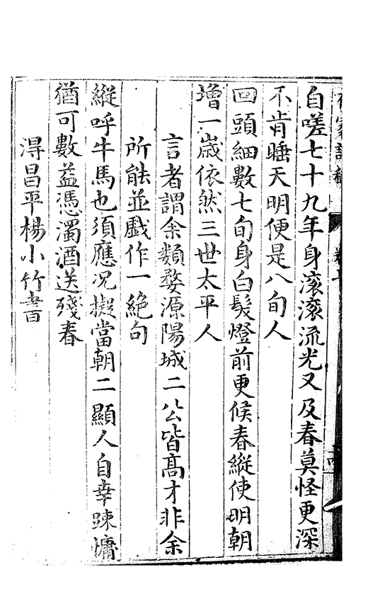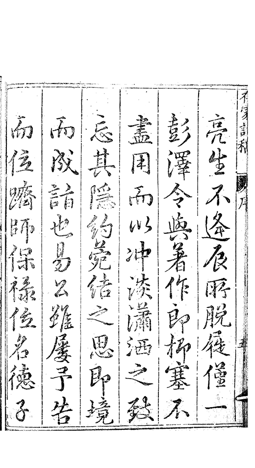 楊榷千古論著一家又要能舍公詩美古今稱詩以雅澹超曠名其家則無善□元亮宗試取公集相提而論元亮不嗜榮利環堵蕭然簟瓢屢空而公致宰