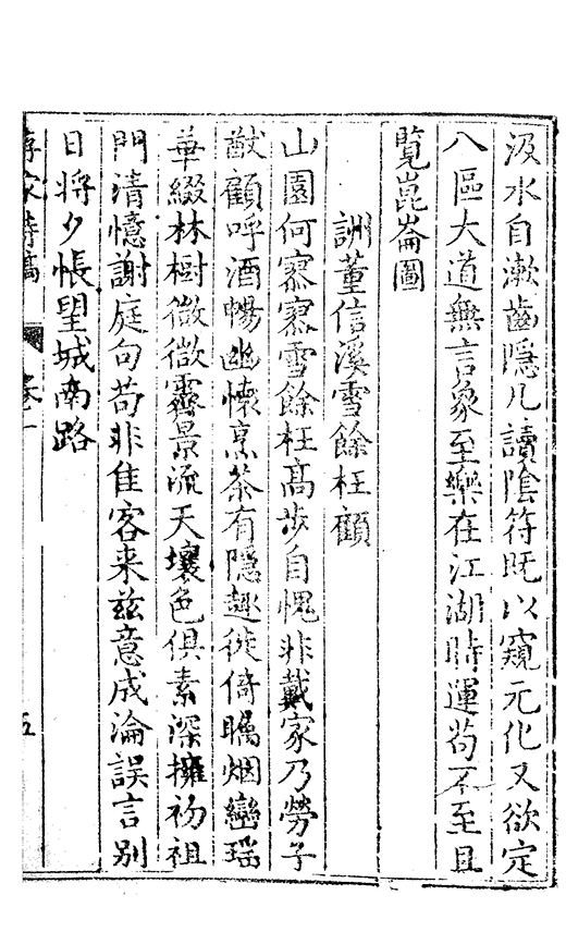 山園何𡪹𡪹雪餘枉髙歩自愧非戴家乃勞子猷顧呼酒暢幽懷烹茶有隠趣徙倚矚烟巒瑶華綴林𣗳㣲㣲霽景流天壤色俱素深擁𥘨祖門清憶謝庭句苟非佳客来兹意成淪誤言別日将夕悵望城南路