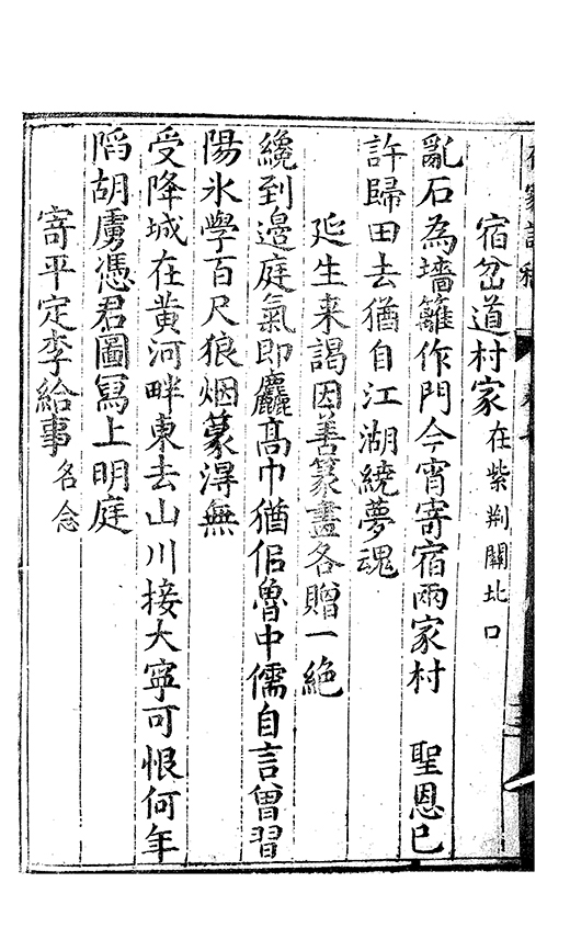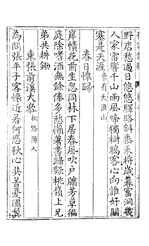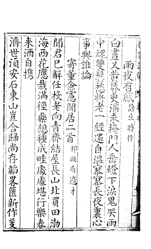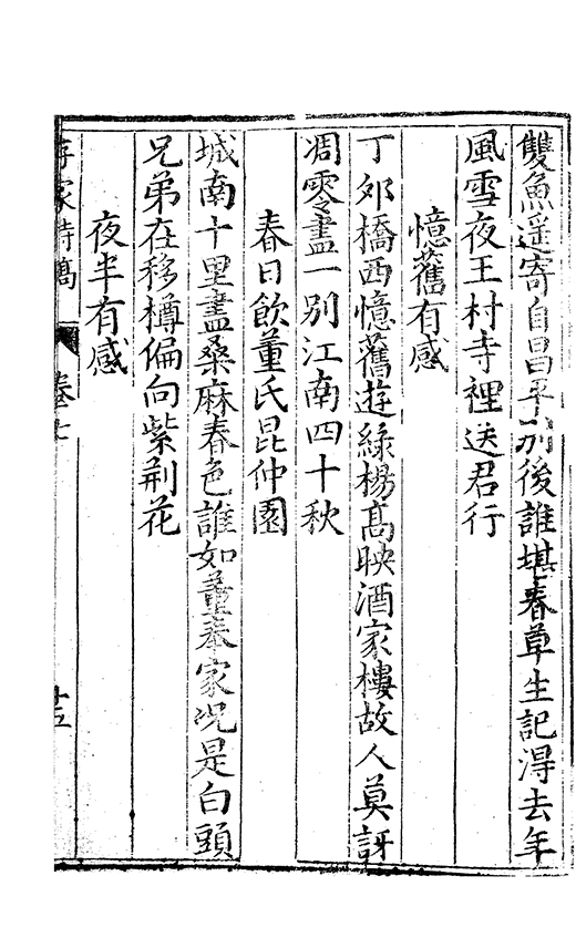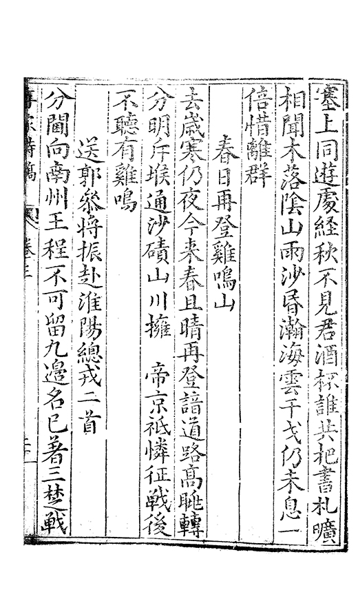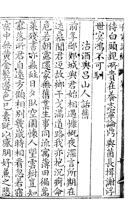 前年酀𨜒城與君始相遇慷慨夜深言㪽期在逺慕聞君返故鄉干戈滿道路我亦抱沉痾命危若朝露還家無舊業生事同流寓薄田徧蒿萊殘書亦蟲蛀日夕臥空園懷人望雲𣗳豈知𡪹落㪽君自逺方顧相別㡬嵗時相㸔忽若寤槖中無黃金鬢邉色已素既以感朋好兼之悲