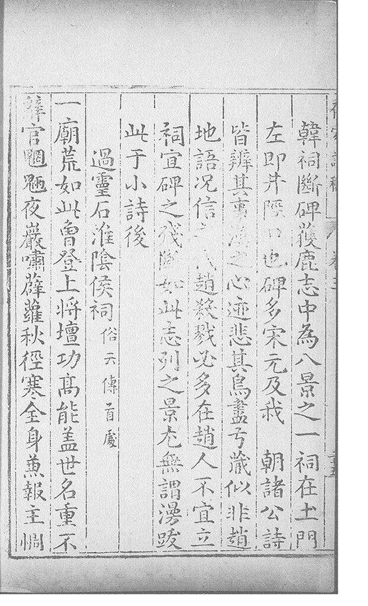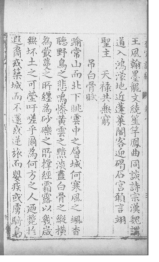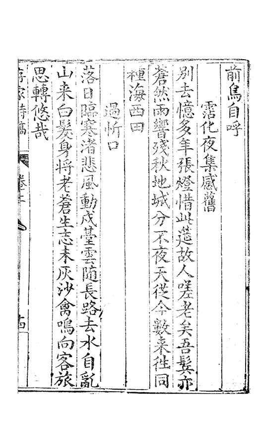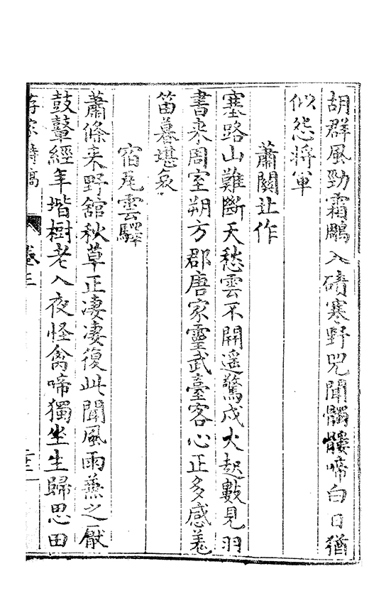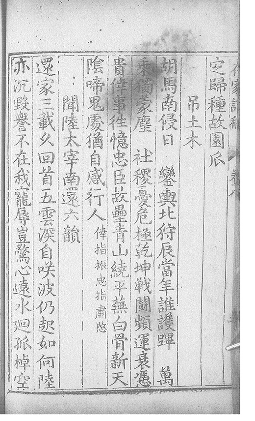 胡馬南侵日鑾輿北狩辰當年誰護蹕萬乗獨䝉塵社稷憂危極乾坤戰鬪頻運衰憑貴倖事徃憶忠臣故壘青山繞平蕪白骨新天隂啼鬼𠁅猶自感行人倖指振忠指肅愍